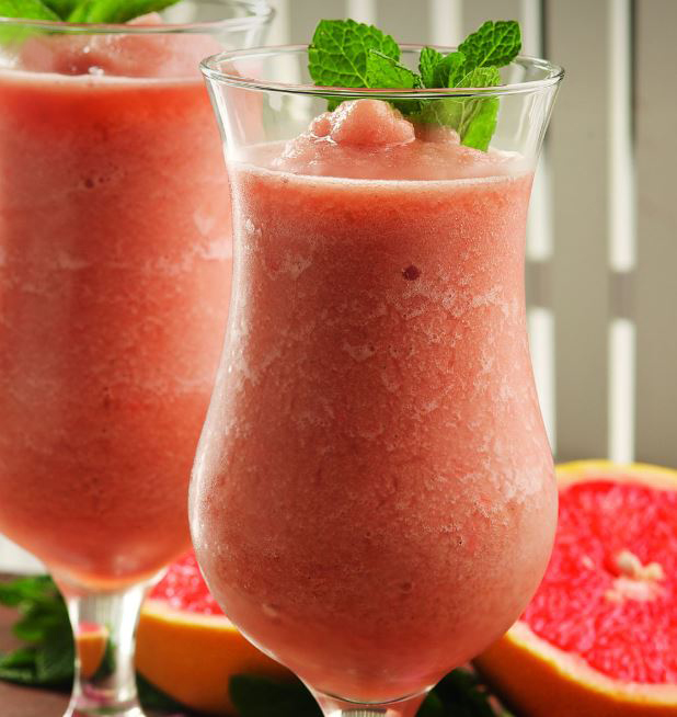 - Pon en el vaso los pomelos, el azúcar, el hielo, el licor de menta, unas hojas de menta y la clara de huevo. Tritura 2 minutos a velocidad progresiva 5-10.