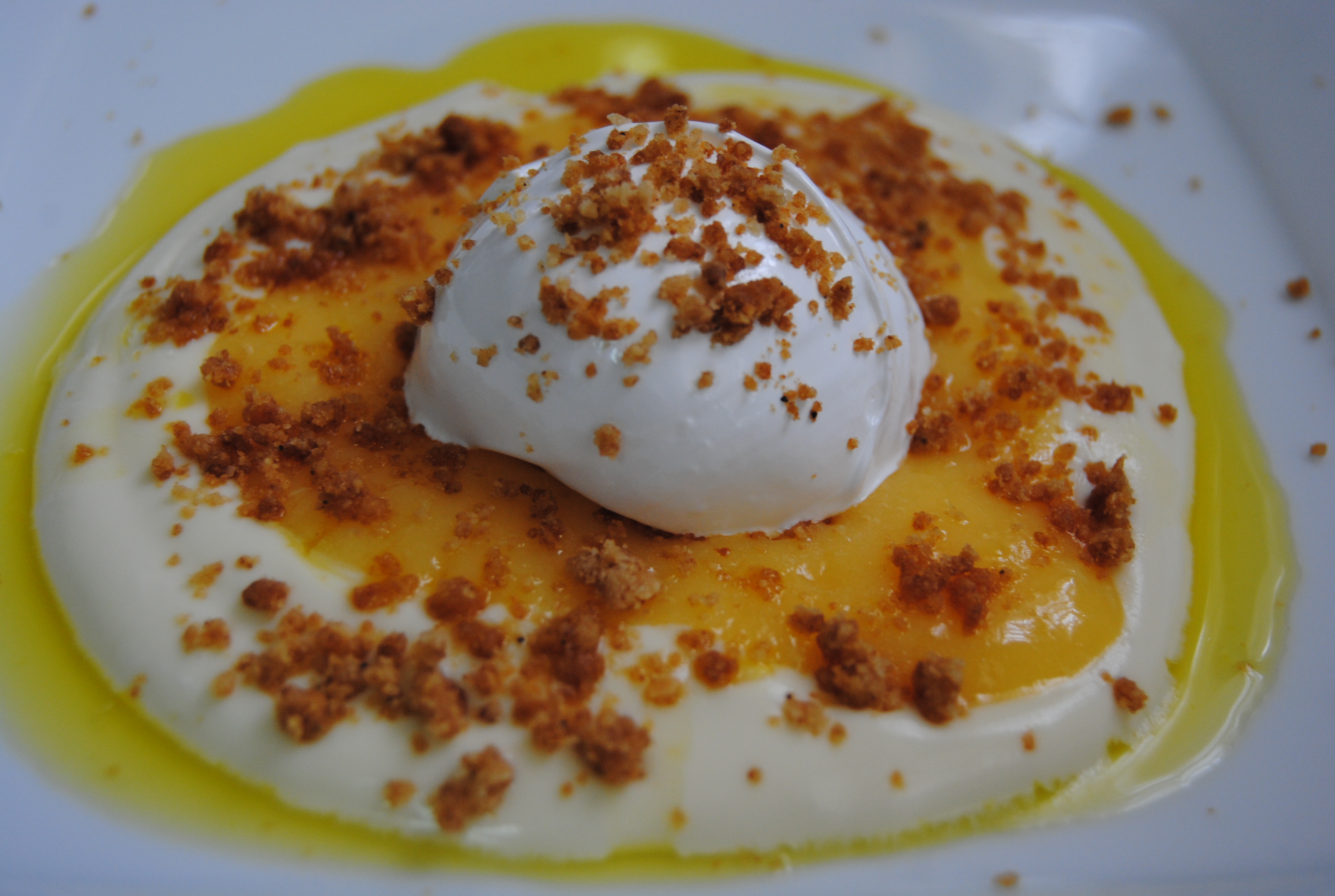En un plato redondo, coloca una porción de mousse de chocolate blanco, vierte encima la crema de limón y, alrededor de la misma, la reducción de naranja. Echa por encima el cuscús de streusel y termina con una quenelle de merengue helado o helado de vainilla.
