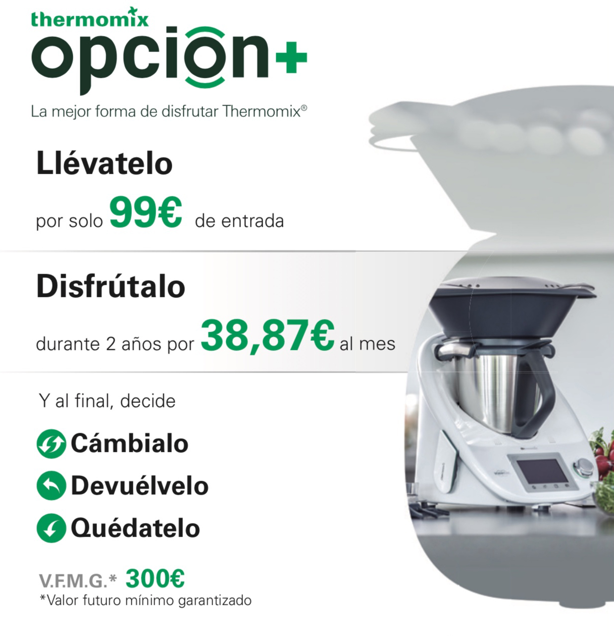 - Podrás cambiarlo por otro nuevo, cada 2 años tendrás la opción de tener un nuevo Thermomix® (siempre en garantía), con valor mínimo garantizado de 300€.