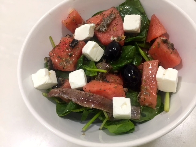 Pongo en una bol grande las hojas de espinaca, los dados de sandía, las aceitunas, el queso feta, las anchoas y la hierbabuena troceada a mano. Reserve en el frigorífico hasta el momento de servir.