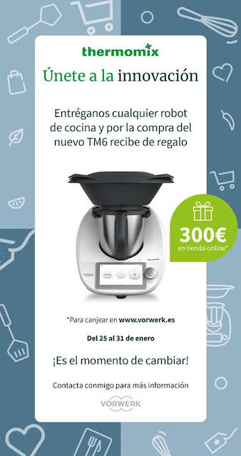 Desde el día 25 al 31 de enero, entregando cualquier robot de cocina, funcione o no (exprimidor, batidora, molinillo....etc) y por la compra del nuevo Thermomix TM6 tienes de regalo 300 euros para utilizarlos en la tienda online de thermomix, donde podrás elegir: