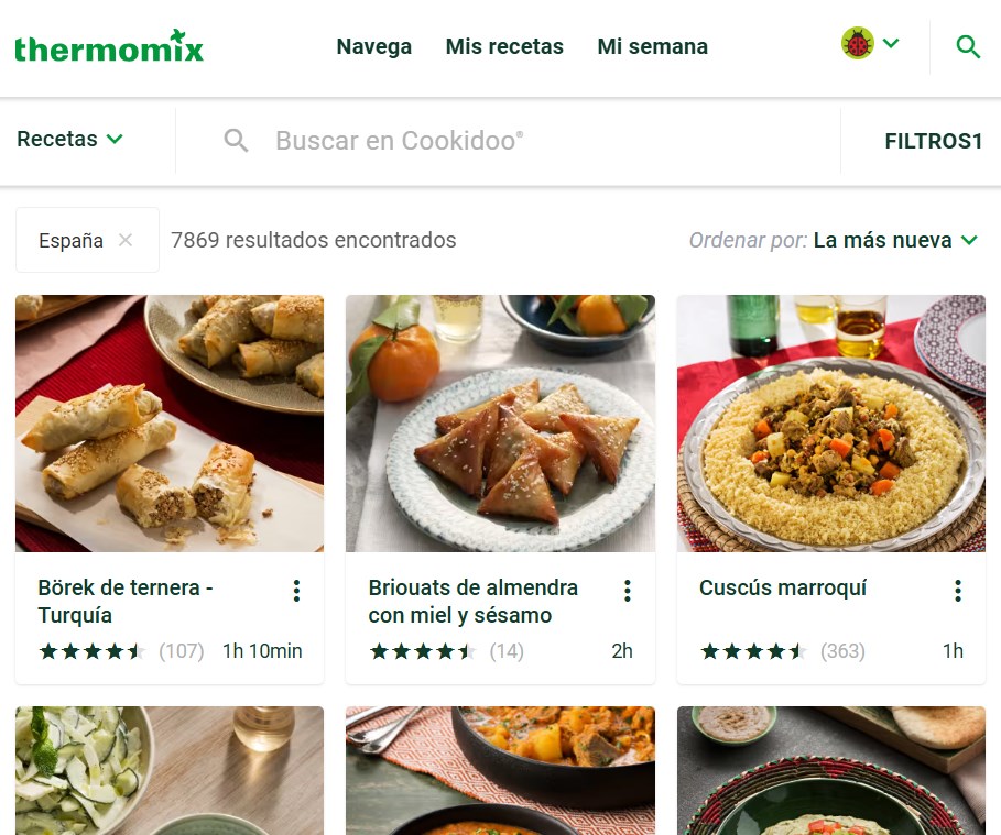 -Nos permite búsqueda de recetas entre más de sus 100.000 recetas posibles. Recetas de todos los países, con cocina autóctona, recetas elaboradas para Thermomix, bajas en calorías, sin gluten.