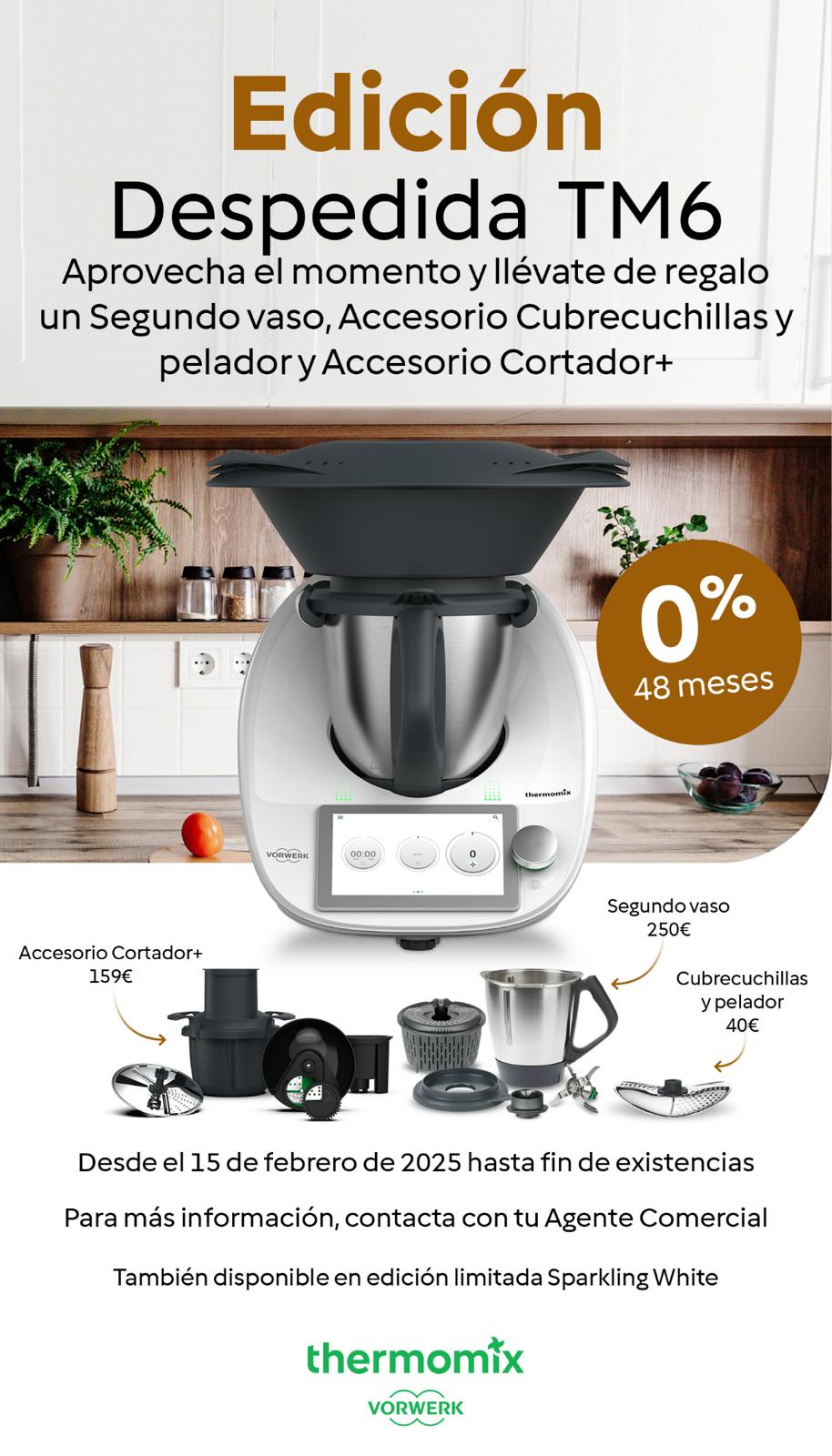 También tenemos una edición de despedida del TM6. ¿Interesante? Yo creo que sí, pues por el mismo precio que un TM6, tendrás un segundo vaso, un cortador + y un cubrecuchillas de regalo, todo ello valorado en 450€. Y lo tienes con financiación al 0%. Vamos que con lo que ahorras cada mes el Thermomix se paga solo. Esta edición es ideal para restauración.