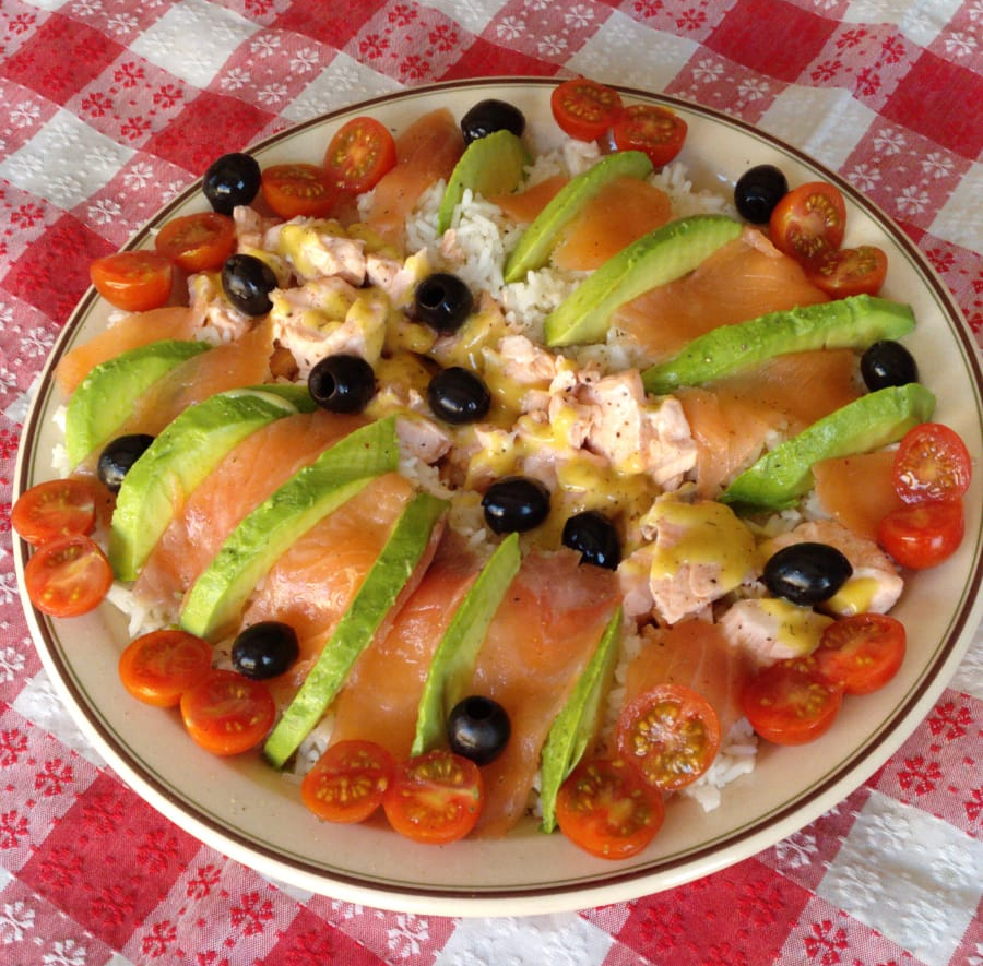 - Ponga el arroz en una fuente, disponga encima el salmón al vapor cortado en trozos, las láminas de salmón ahumado y los trozos de aguacate. Decore con un poco de eneldo y pimienta negra recién molida. Sirva templado o frío acompañado con la salsa de eneldo.