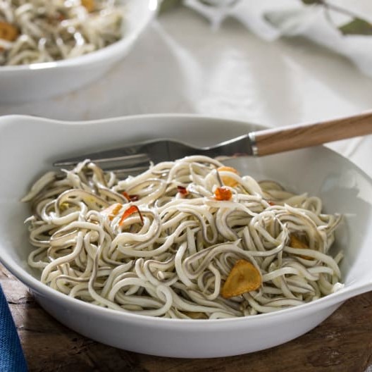 3. Coloque la mariposa en las cuchillas e incorpore al vaso las gulas y la sal y, sin poner el cubilete, rehogue 14 min/120°C/Giro Izda/Vel cuchara. Retire del vaso y sirva inmediatamente.