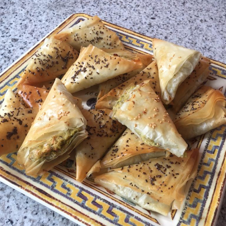 4. Coloca sobre la superficie de trabajo 1 lámina de masa filo, pincélala con mantequilla y superpon otras 2 láminas de masa filo pincelando igualmente cada una con mantequilla. Corta el bloque de láminas de masa filo por la mitad a lo largo y luego haz 4 cortes perpendiculares, de modo que resulten 10 rectángulos de aprox. 10x18 cm. Coloca en uno de los bordes de cada rectángulo una porción de relleno (reserva la mitad para la otra tanda) y distribúyela como un cordón sin llegar a los extremos. Enrolla cada rectángulo y presiona los extremos de cada rollito para que no se salga el relleno. Coloca los rollitos en una bandeja de horno forrada con papel de hornear, pincélalos con mantequilla y espolvorea con las semillas de sésamo o de amapola. Repite este procedimiento con las 3 láminas de masa filo y el relleno restante.