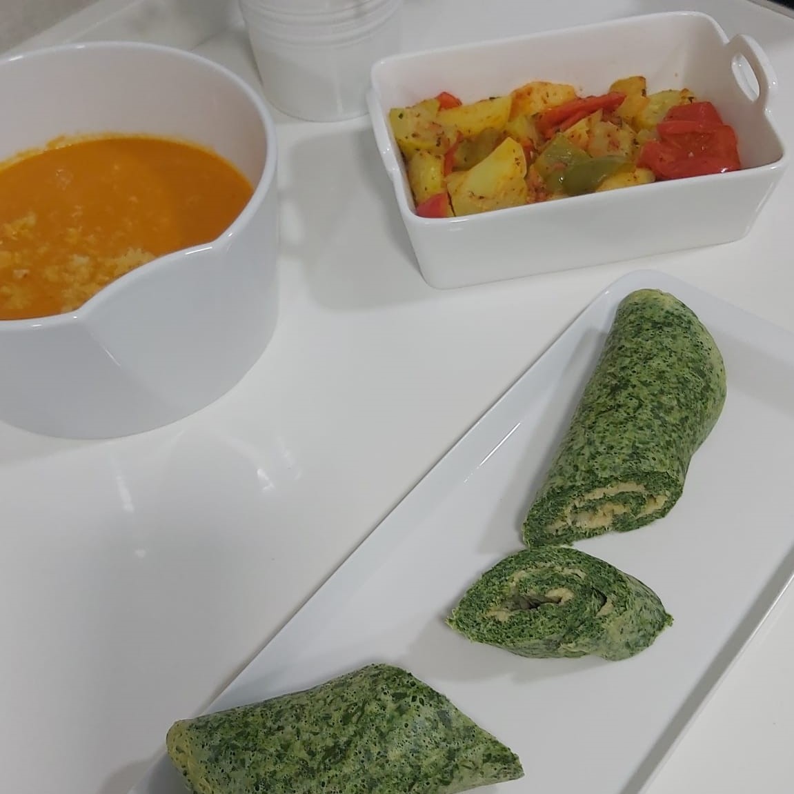 La sopa me recuerda mucho a las sopas de ajo con un toque de tomate, respecto a la tortilla, tengo que decir que nunca había hecho una tortilla de espinacas como lo he hecho hoy en el Varoma y la presentación enrollada es de 10 y, sobre el ratatouille... poco que decir, fácil y un gran acompañamiento para cualquier plato.