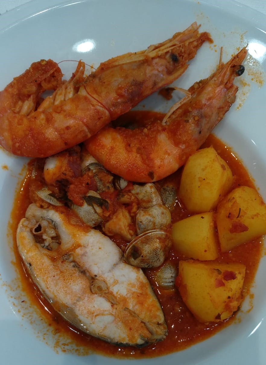 CALDERETA DE DORADA Y MARISCO AL HORNO.