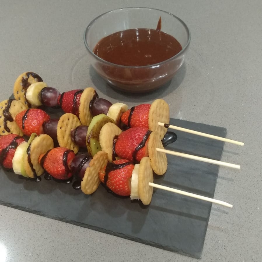 Ponga todos los ingredientes en el vaso y programe 2 min/60°C/vel 3. Retire la salsa a un bol. Monte los pinchos intercalando los gofres mini con las diferentes frutas y sirva acompañados de la salsa.