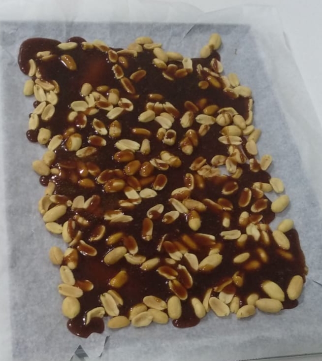 Forre un molde de horno (17x17 cm) con papel de hornear, reparta los cacahuetes en la base y coloque el molde en una superficie resistente al calor.Ponga en el vaso el azúcar, 70 g de agua, la mantequilla y el zumo de limón e inicie Puntos del Azúcar .