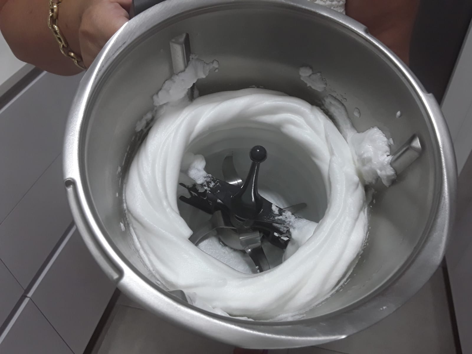 Coloque la mariposa en las cuchillas, luego añada las claras de huevo y programe 8 minutos / velocidad 3.