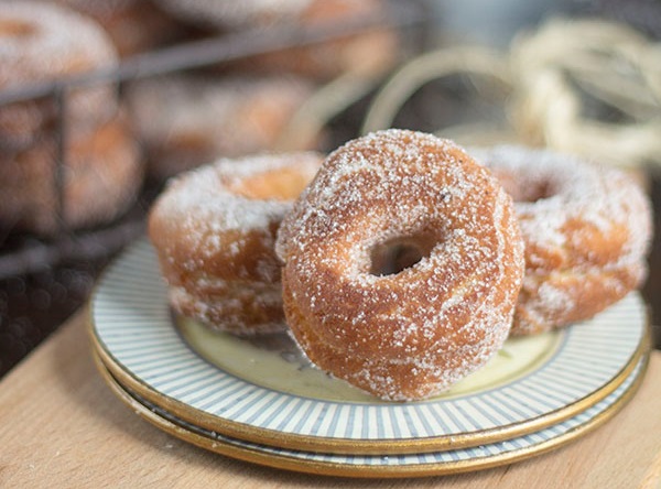 7. Freímos en abundante aceite de oliva hasta que adquieran color. Escurrimos el exceso de aceite sobre un plato con papel absorbente y rebozamos en azúcar.