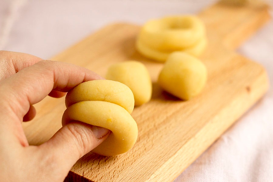 6. Cogemos las bolas de dos en dos y las unimos, haciendo un agujero en medio y dándole forma de rosquilla.