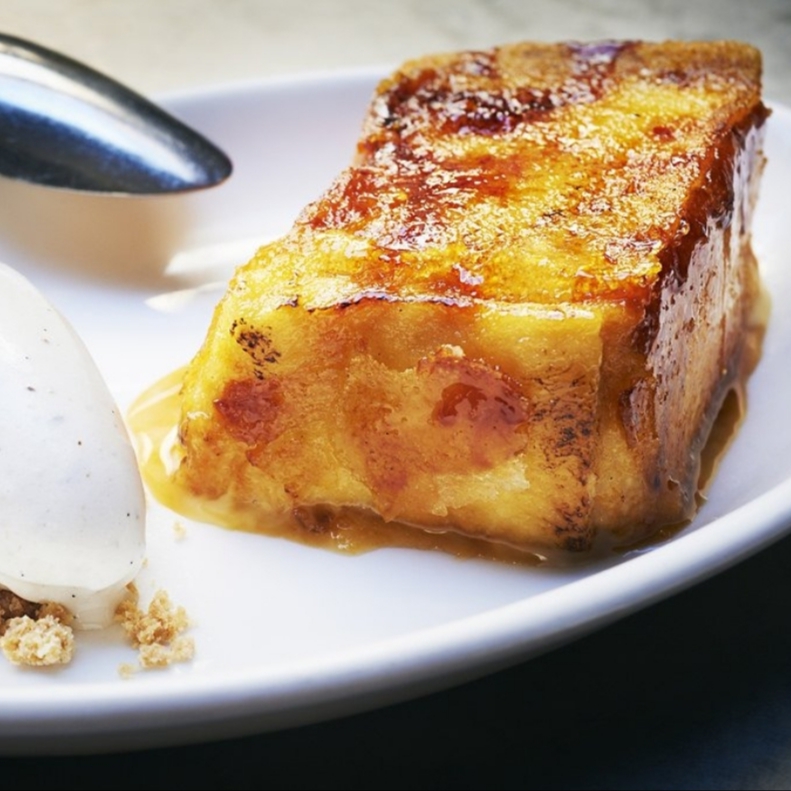 Torrija al vapor (light) de Sobao Pasiego "El Macho®" con bola de helado de Crema de Orujo "Sierra del Oso®"