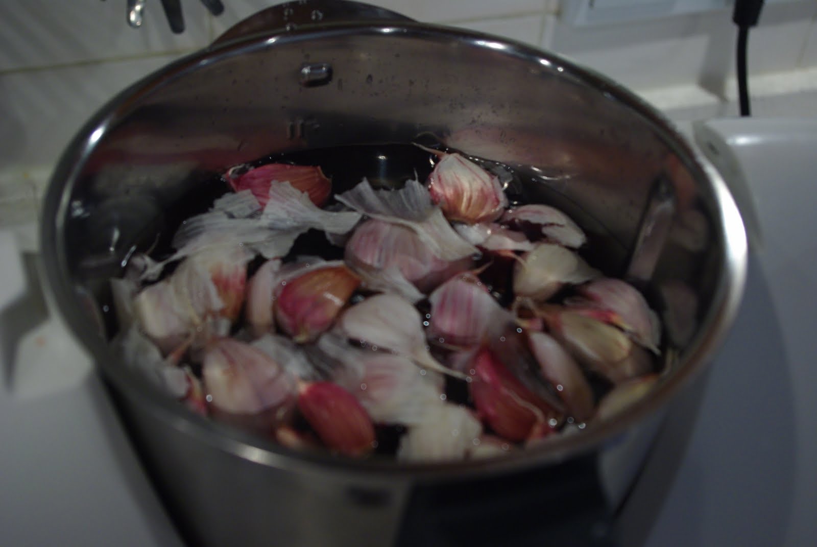 Dejamos reposar un par de minutos y vemos cómo las pieles quedan flotando mientras los ajos han caído al fondo.