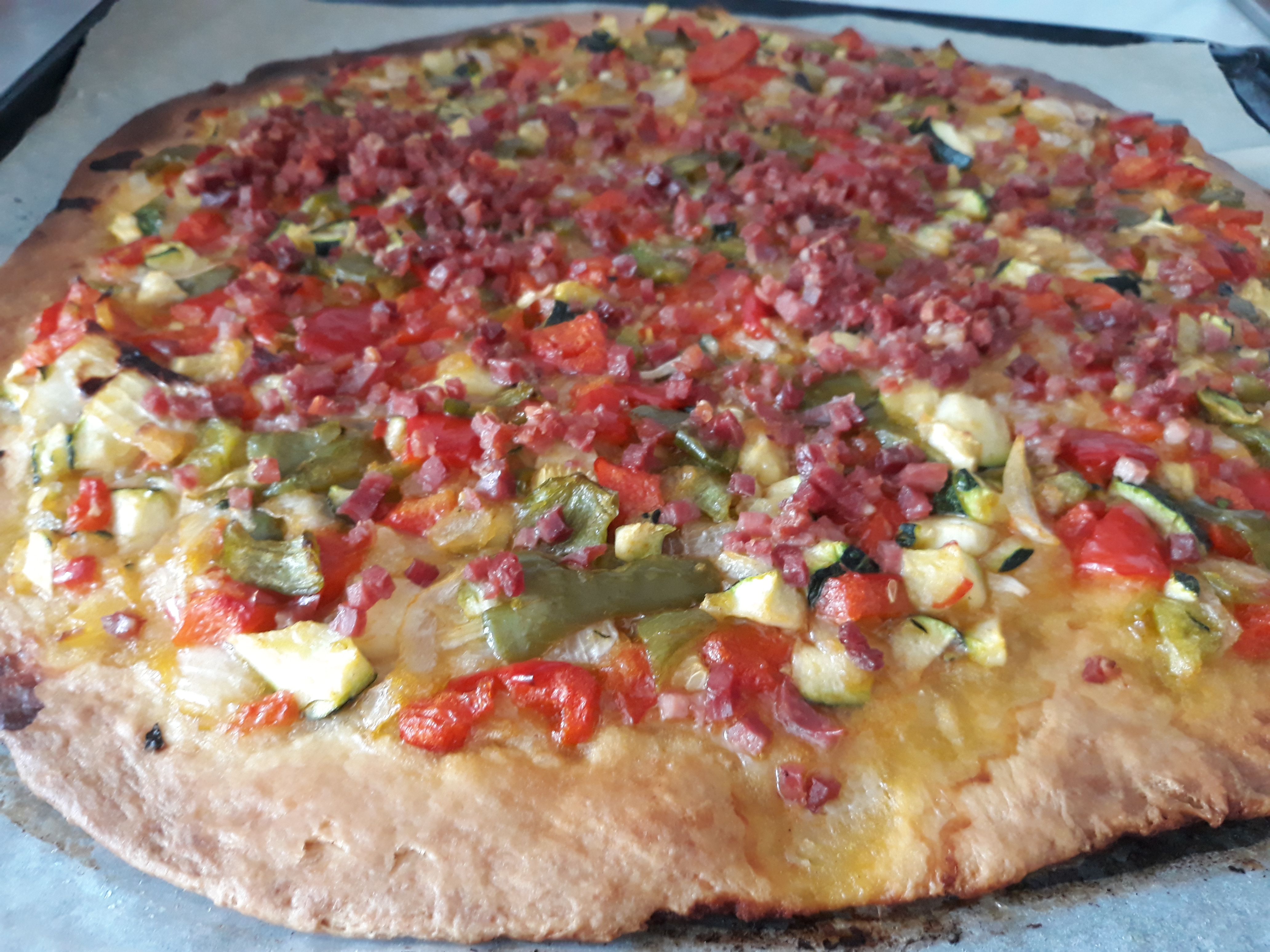 - Pon en el vaso el pimiento rojo y el verde, la cebolla, el calabacín, el aceite, la sal y el pimentón. Trocee 3 seg/vel 4. Cubre la masa con las verduras y los taquitos de jamón ( opcional) y horneamos (200ºC) durante 20 minutos aproximadamente. Servir caliente o fría.
