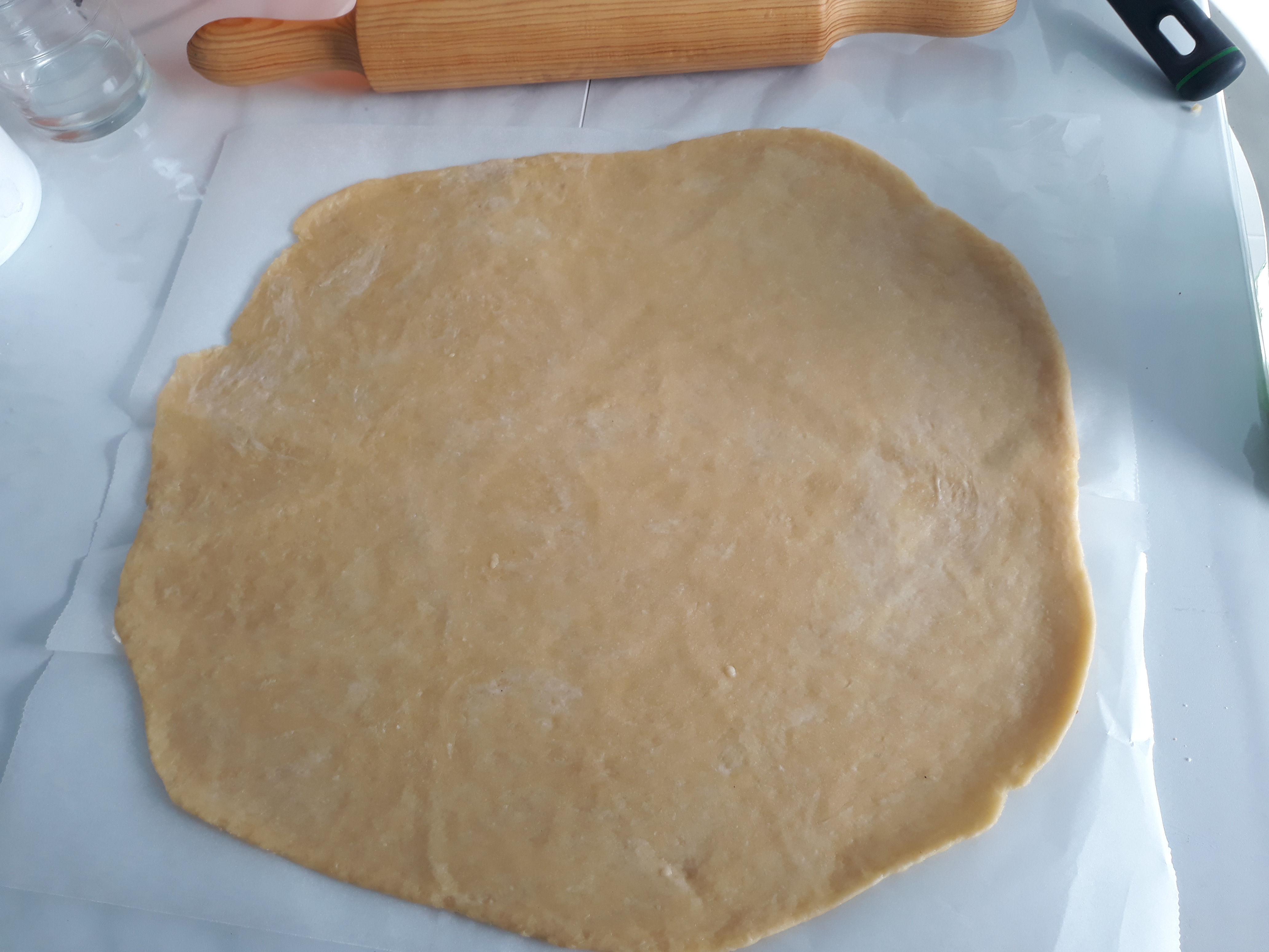 Retira la masa del vaso sobre la bandeja engrasada y extiéndela muy fina, con un rodillo o con las manos.