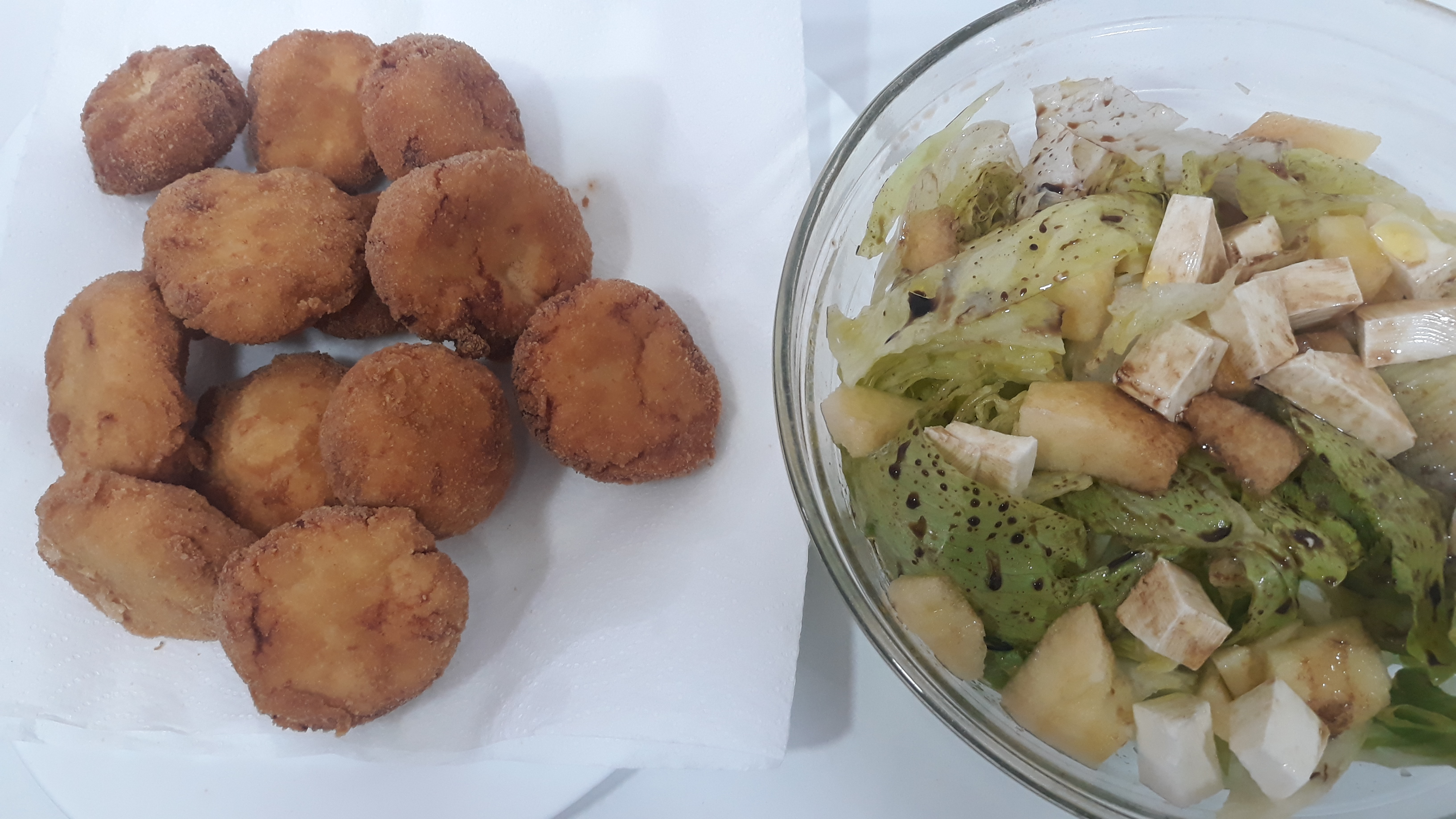 - Retiramos del vaso y hacemos bolitas pequeñas (del tamaño de una nuez) y luego las aplastaremos con cuidado para hacer los nuggets. En un bol batimos el huevo con el agua y pasamos cada uno de los nuggets por el huevo y el pan rallado. Freimos los nuggets en aceite medianamente caliente hasta que estén dorados y los colocamos sobre papel de cocina para que absorba todo el aceite sobrante. Servimos, con qué lo servirias tú? yo como ves con una ensalada.