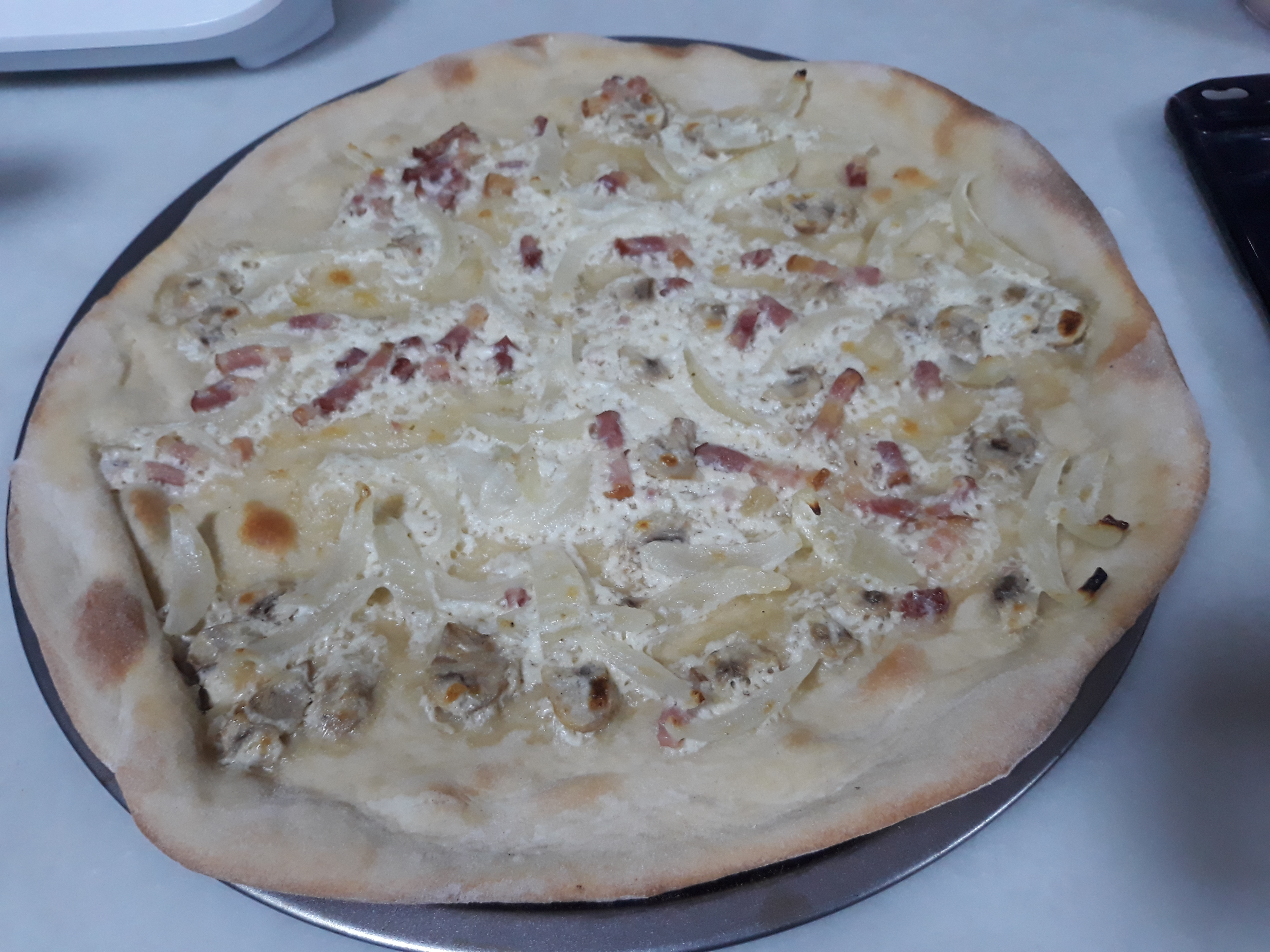 Tarta flambeada alsaciana (pizza carbonara) nuestra favorita