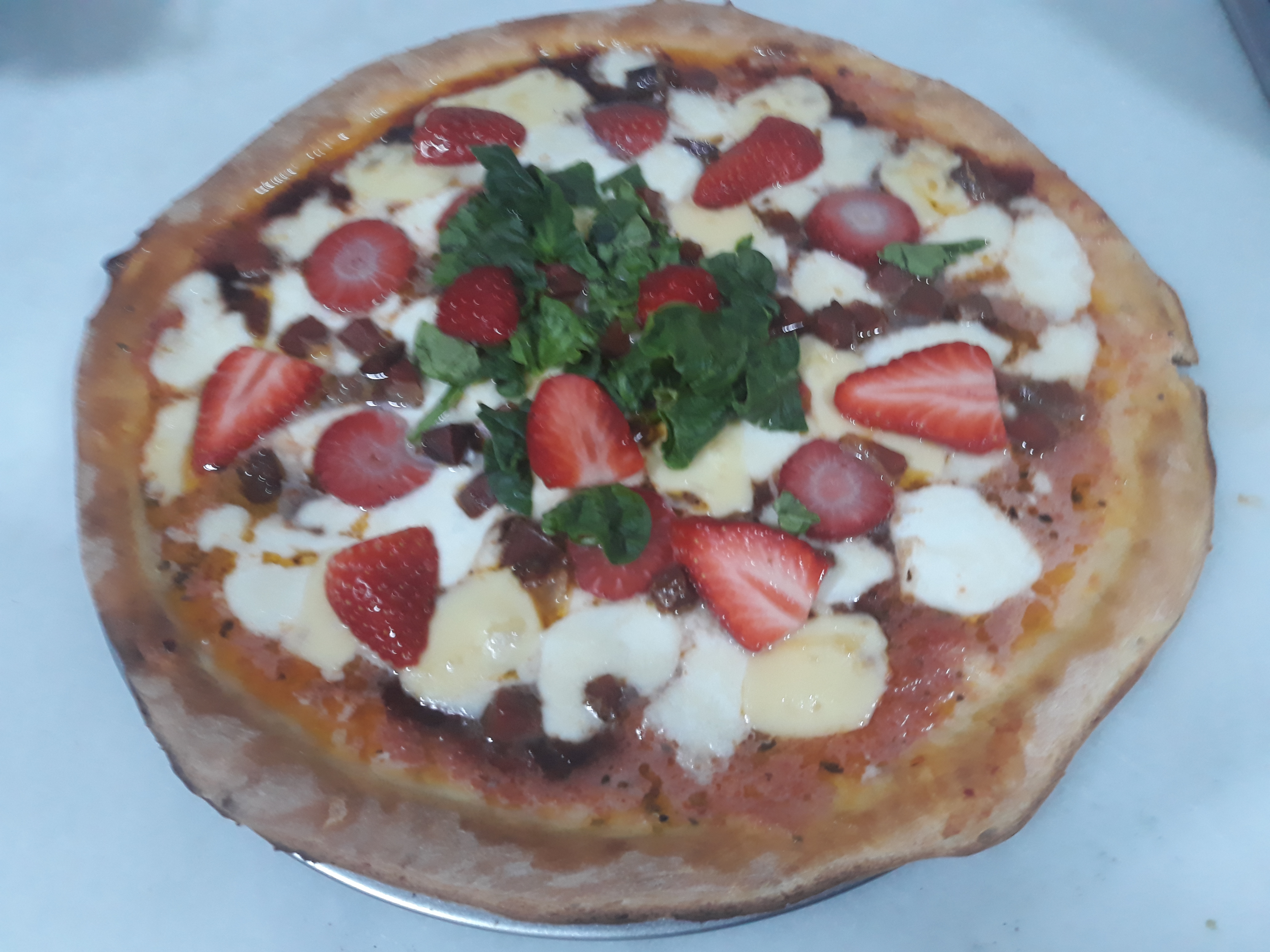 - Hornee nuevamente (250°C) durante 5-7 minutos o hasta que el queso esté fundido. Retire del horno, decore con rodajas de fresas y las hojas de rúcula ( yo le puse espinacas), corte en porciones y sirva.