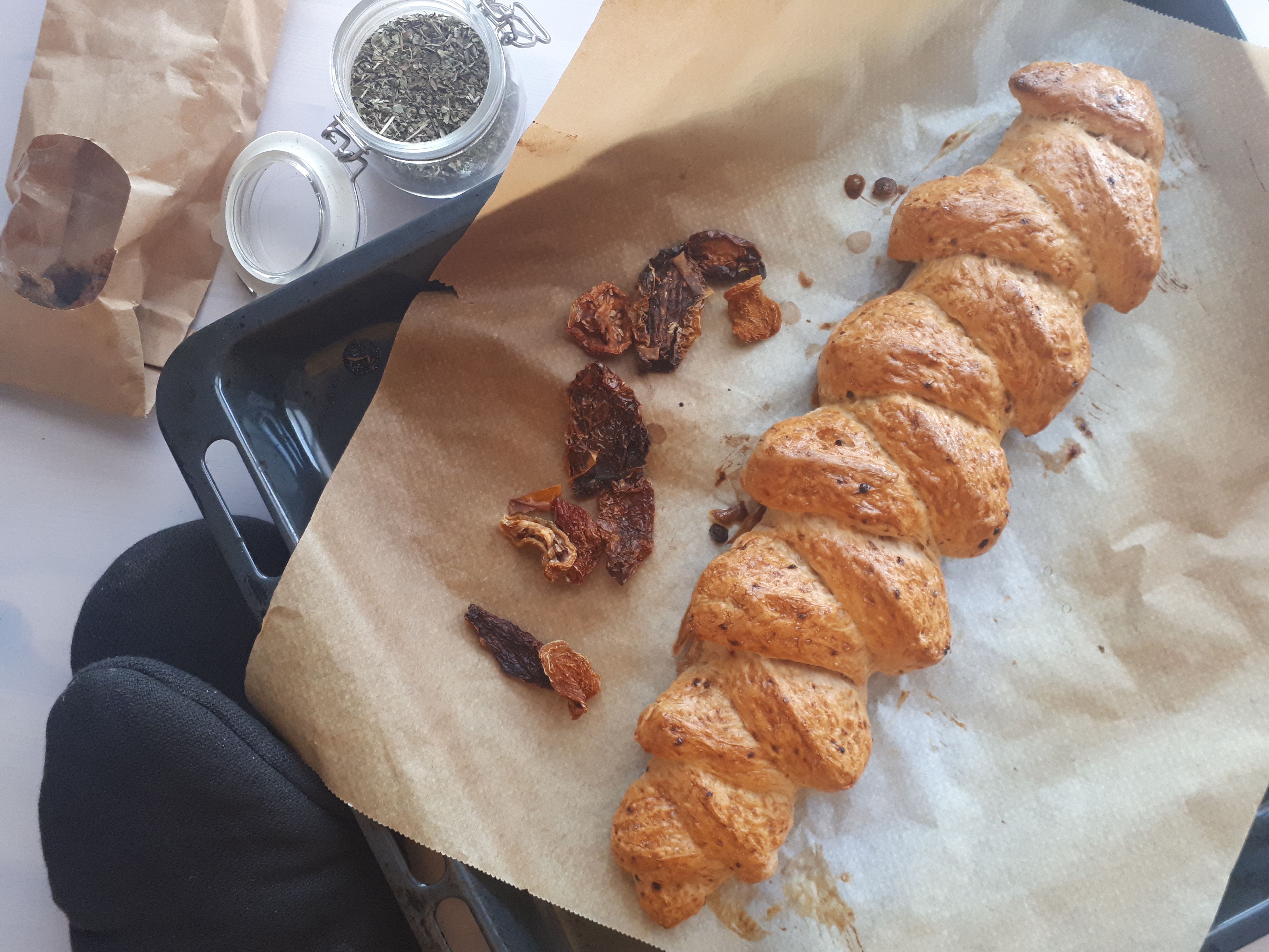 Esta vez con tomates secos y tomillo, pero puedes darle el sabor que más te guste, dulce o salado. Te dejo unas cuantas ideas.... Con chocolate negro, con nueces y pasas, con emmental y orégano, con aceitunas negras o anchoa....etc. Elige la opción que más te guste y disfruta en casa del mejor pan recién hecho.