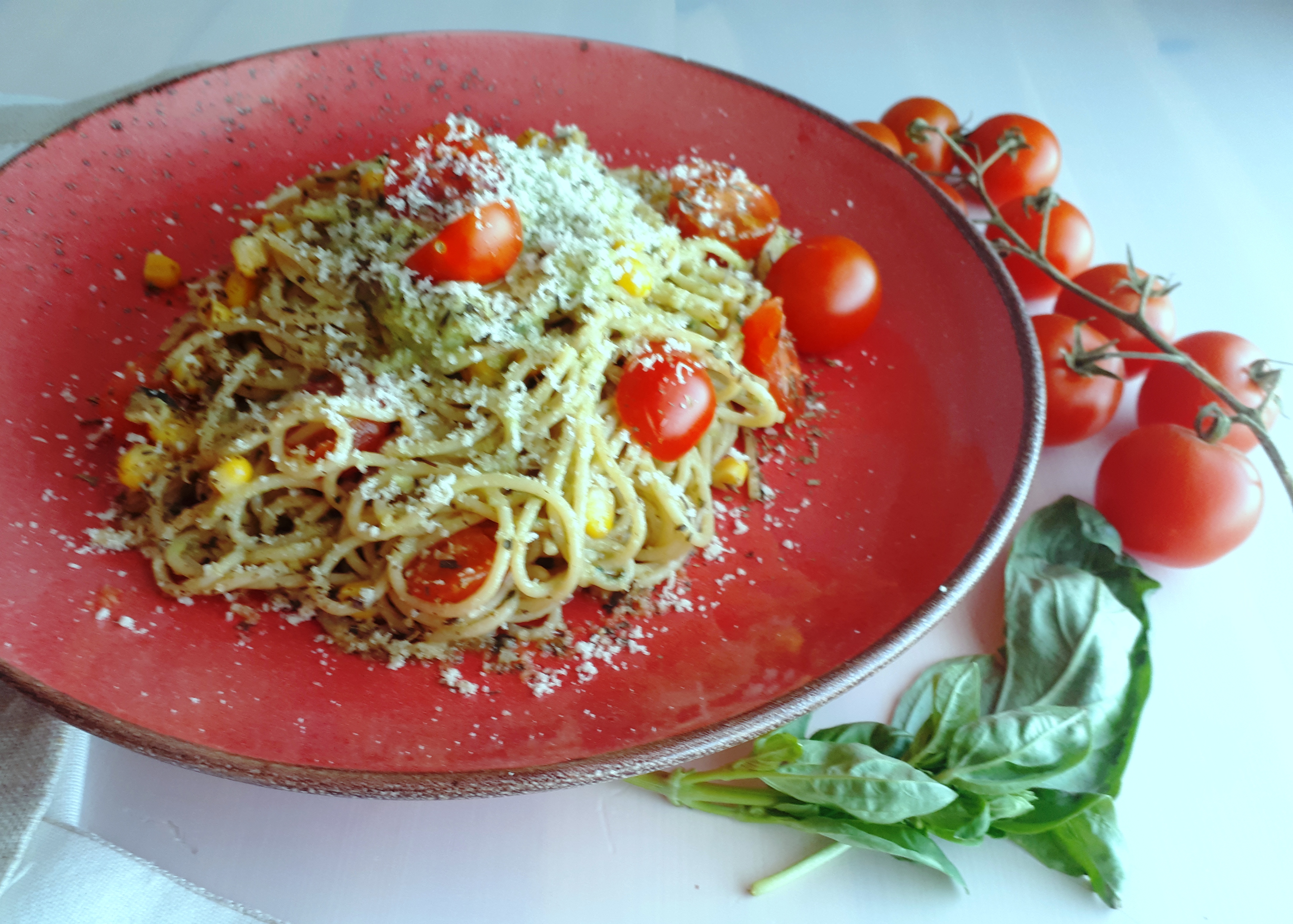 4.- Cuela los espaguetis con ayuda del recipiente varoma y mezcla con la salsa de aguacate, los tomates cherry y el maíz. Espolvorea con queso parmesano y sirve inmediatamente.