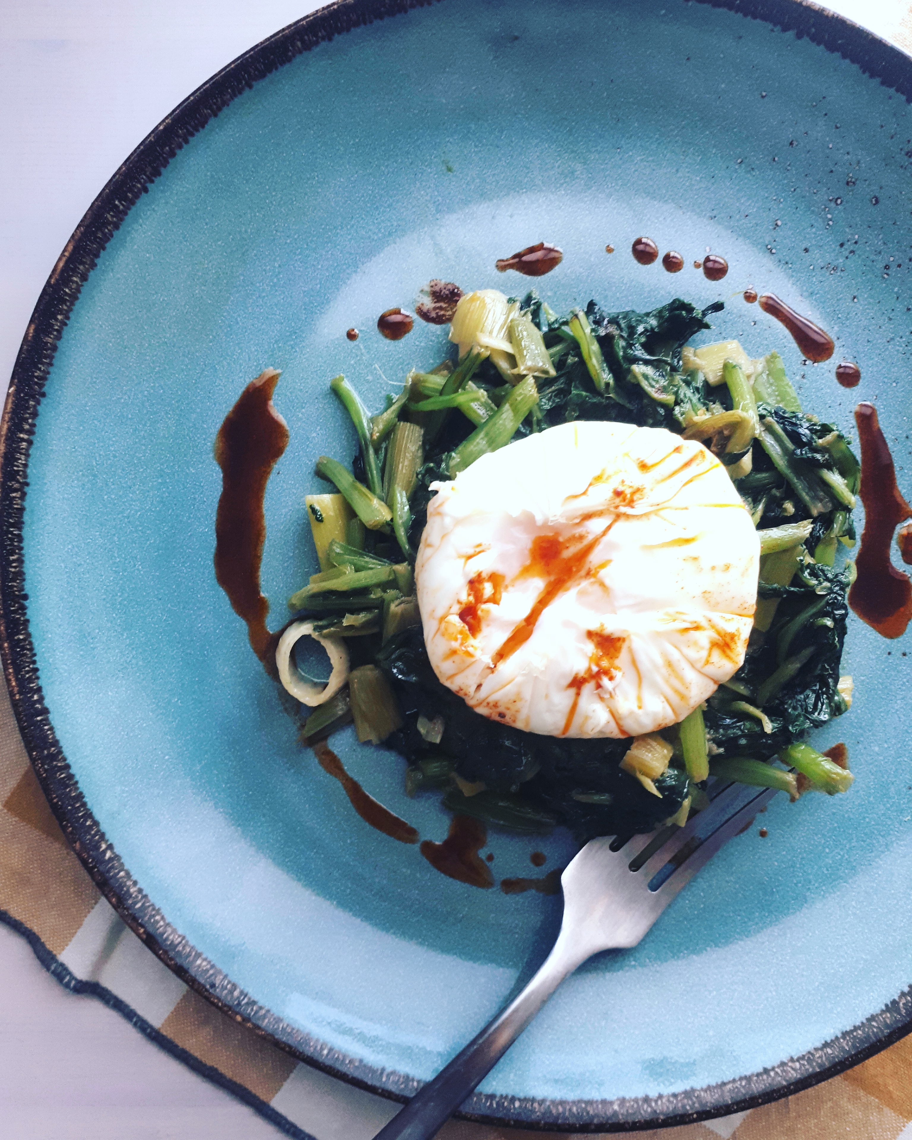 Sirve las acelgas con el huevo encima y riega con el aceite de pimentón.
