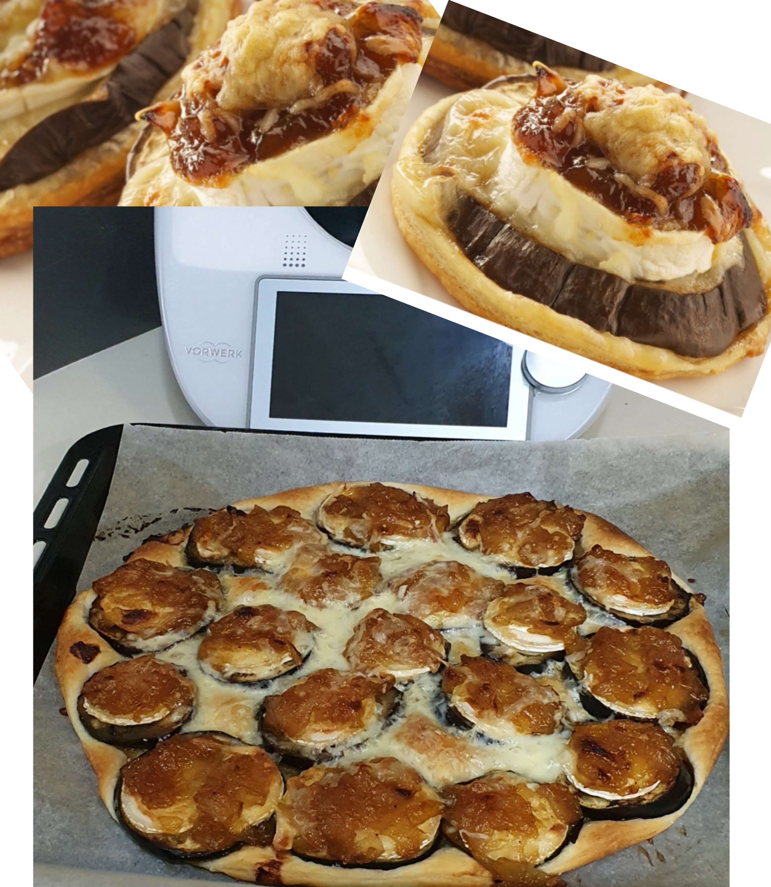 - Extendemos la lámina de hojaldre y cortamos círculos de tamaño un poco más grande que las rodajas de berenjena. Colocamos los círculos de hojaldre en la bandeja del horno forrada con papel de hornear. Ponemos en cada círculo una rodaja de berenjena, encima una rodaja de queso y una cucharada de cebolla caramelizada.