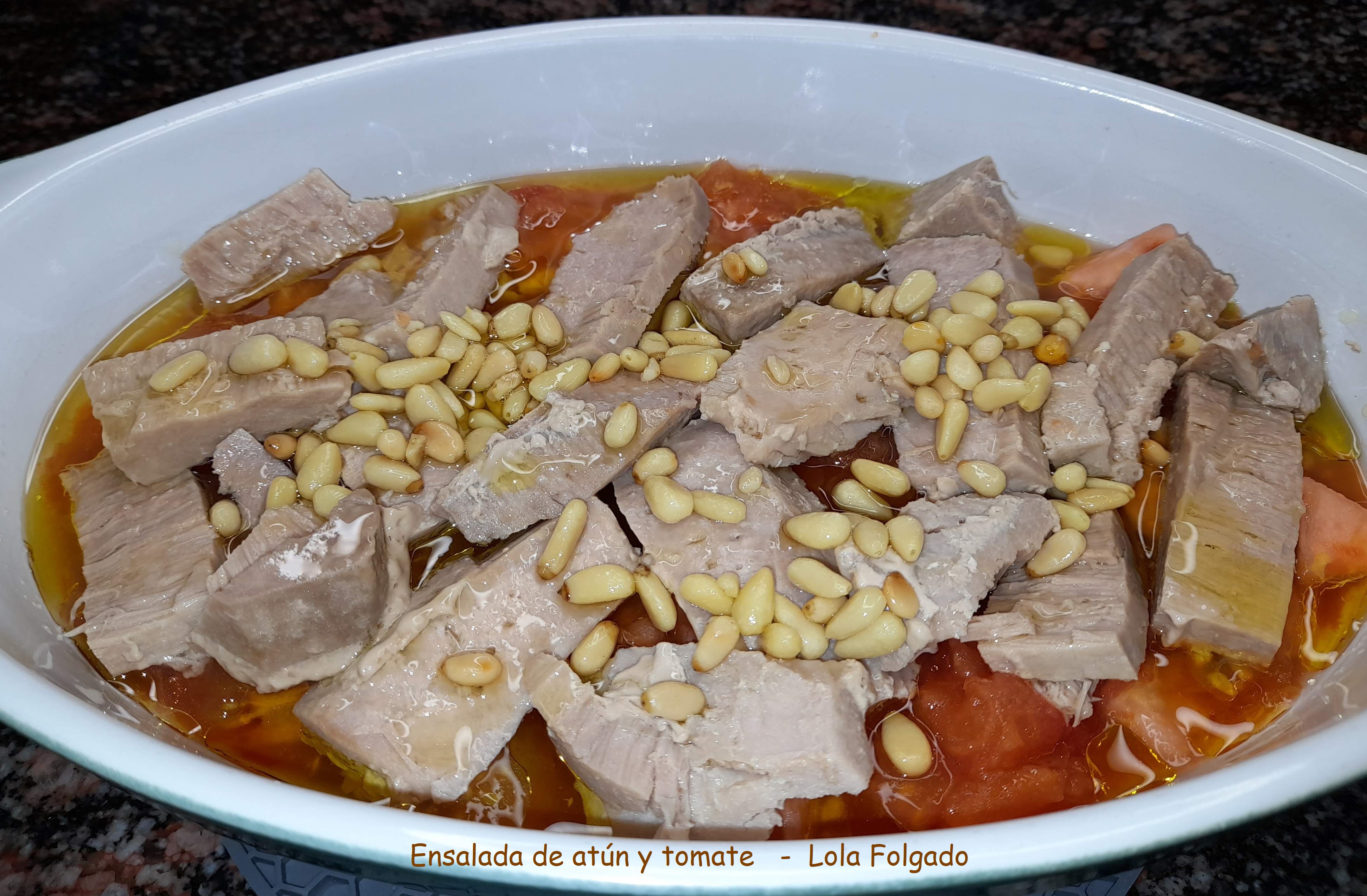 - En la ensaladera disponer los tomates pelados y troceados a tu gusto, verter el atún desmenuzado, añadir los piñones sofritos y aderezar con un chorrito de aceite. A disfrutar.