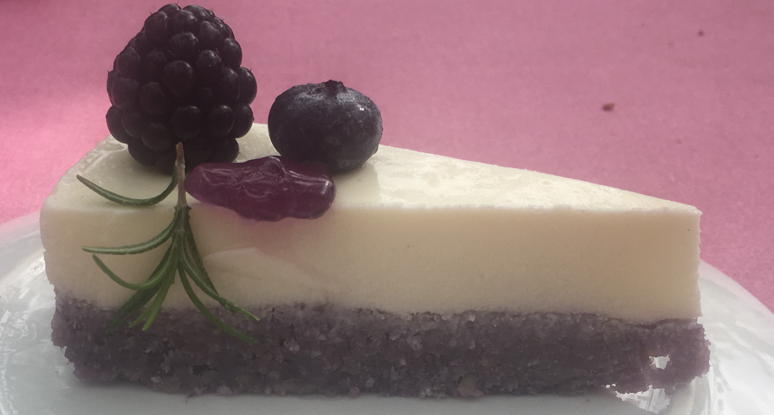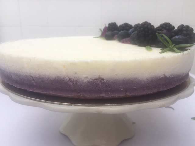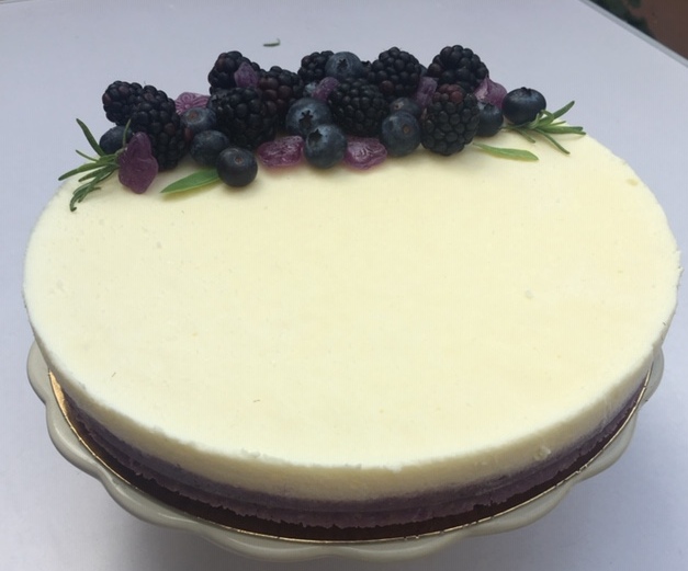 Tarta de chocolate blanco al aroma de violetas con frutos del bosque