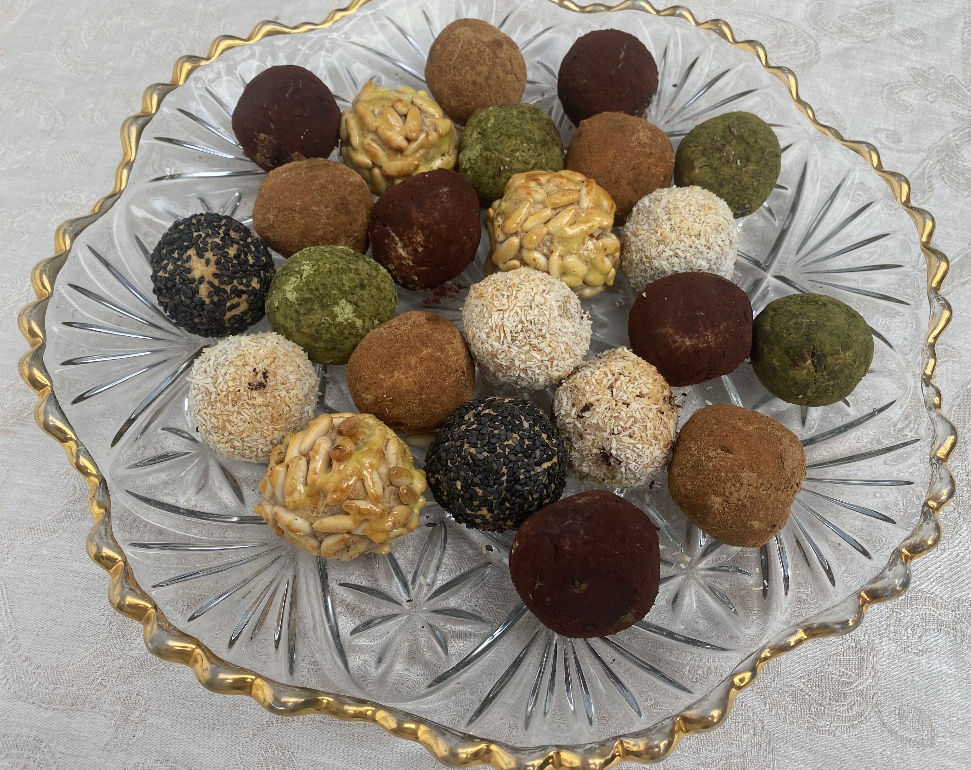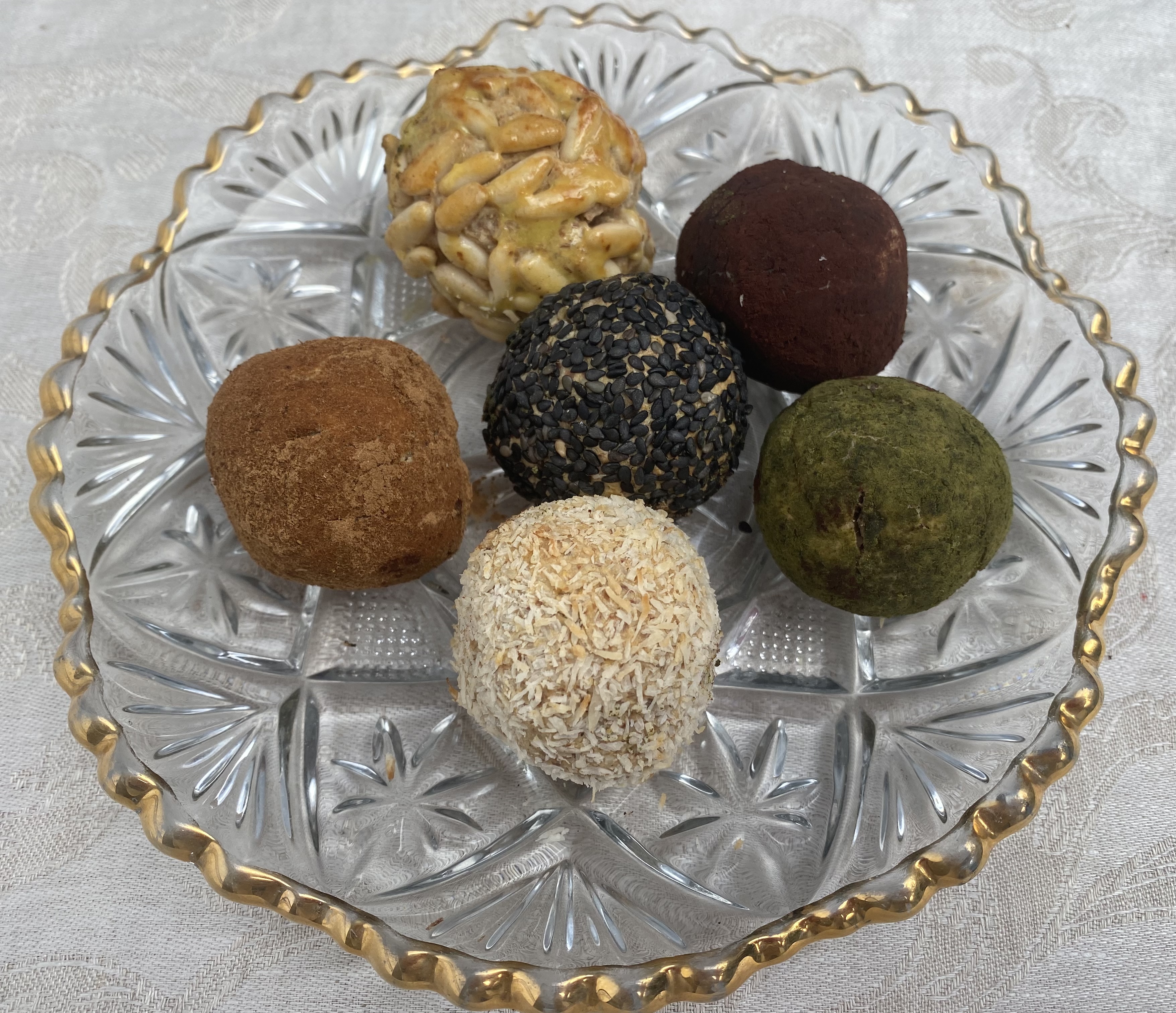 Los ingredientes que lleva cualquier panellet (bolita) son el azúcar, los huevos, patata cocida, almendras molidas, rebozadas con piñones, canela, coco, cacao, crujiente de almendra etc. En esta ocasión he sustituido la patata por el boniato y el azúcar por dátiles. Los más conocidos son los panellets de piñones. Reboza con lo que más te guste.