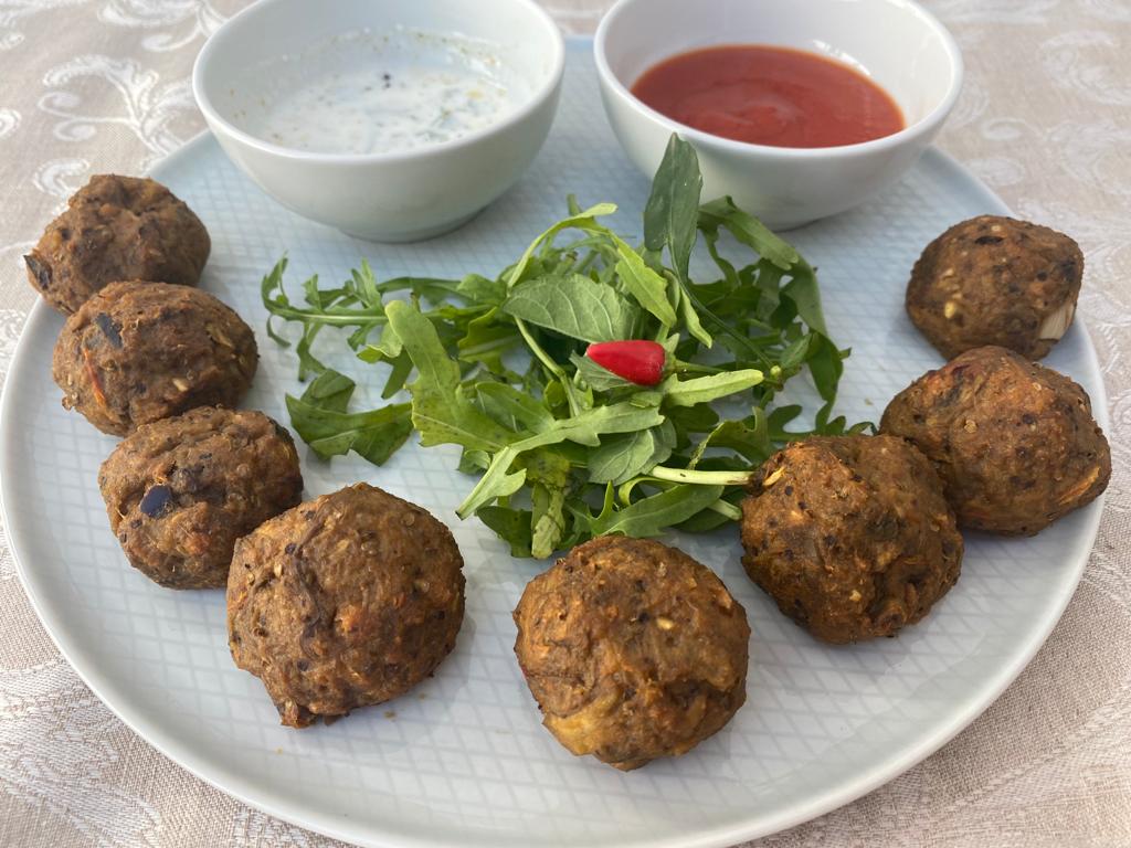 Albóndigas de berenjena acompañadas de ketchup salsa de yogur
