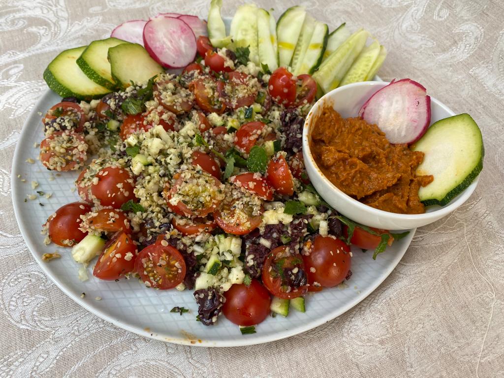 ENSALADA CRUDIVEGANA DE COUSCOUS DE COLIFLOR Y PATE DE PIMIENTOS