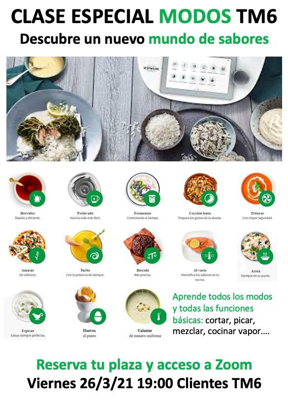 Hola a tod@# , espero que hayáis disfrutado mucho de todas nuestras clases y talleres. Ahora quiero invitaros a uno muy especial. Es una clase para todas las personas que tenéis el Thermomix . TM 6 no dejéis de ver esta clase.en ella te ayudamos a sacar el máximo partido a tu gran aliado en la cocina. No te la puedes perder . Descubre todos los modos y funciones ,de forma amena . Saludos Lore