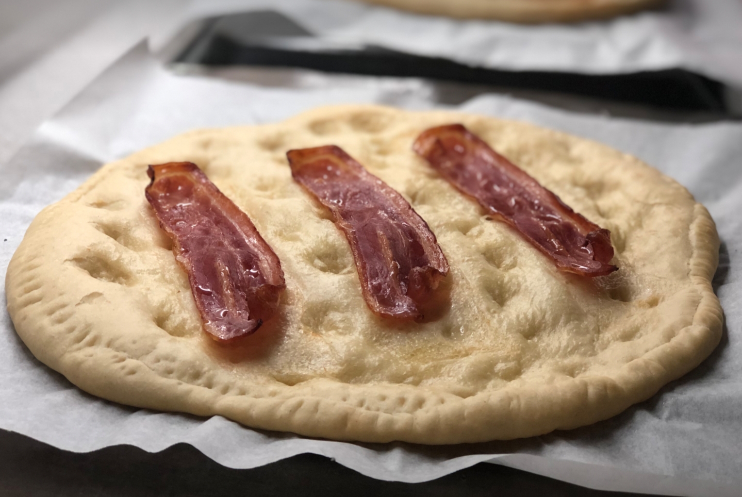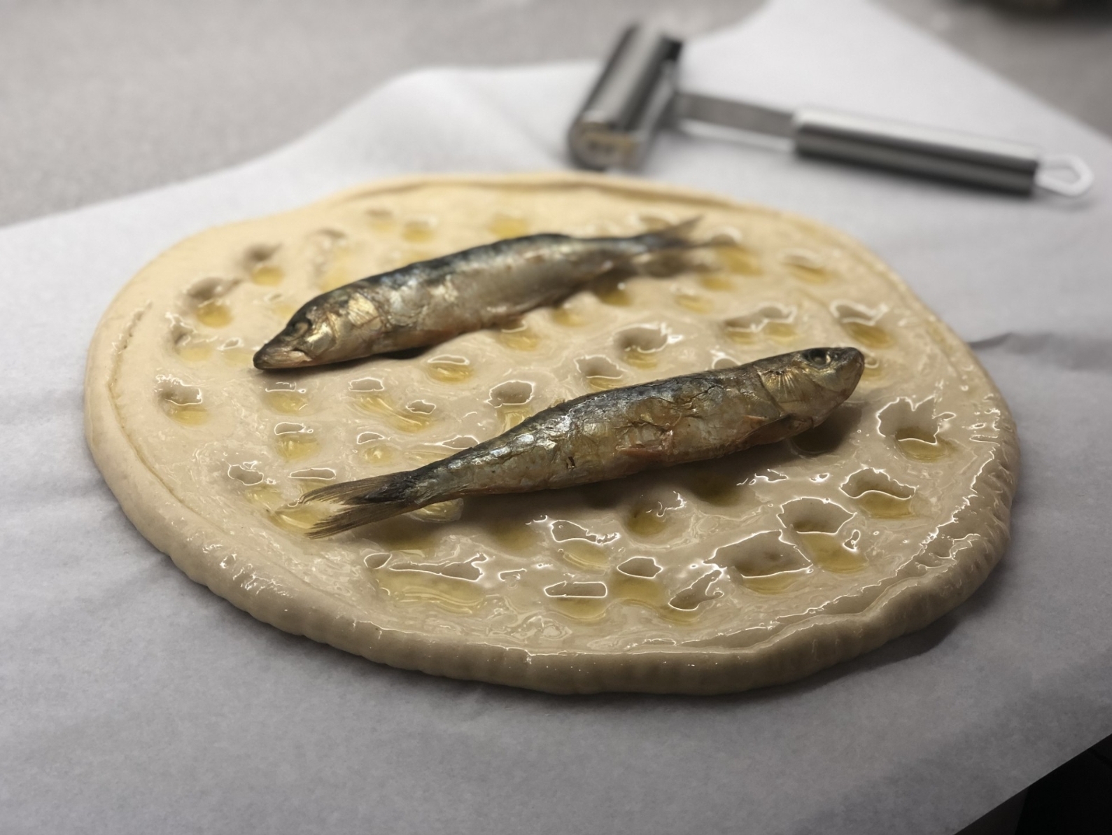 - Presiona toda la superficie con los dedos y riega con el resto del aceite. Pon las sardinas o el beicon (en el pueblo también las hacen mixtas y están buenísimas).