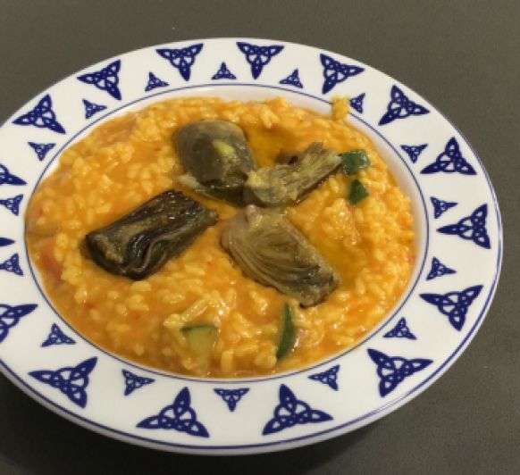 Cómo se nota que el tiempo ha sido fresquito, por llamarlo de alguna manera , a Vicky le han entrado ganas de un Arroz Cremoso para templar el cuerpo... eso sí, vegetariano y con alcachofas, ya que estamos acabando la temporada...