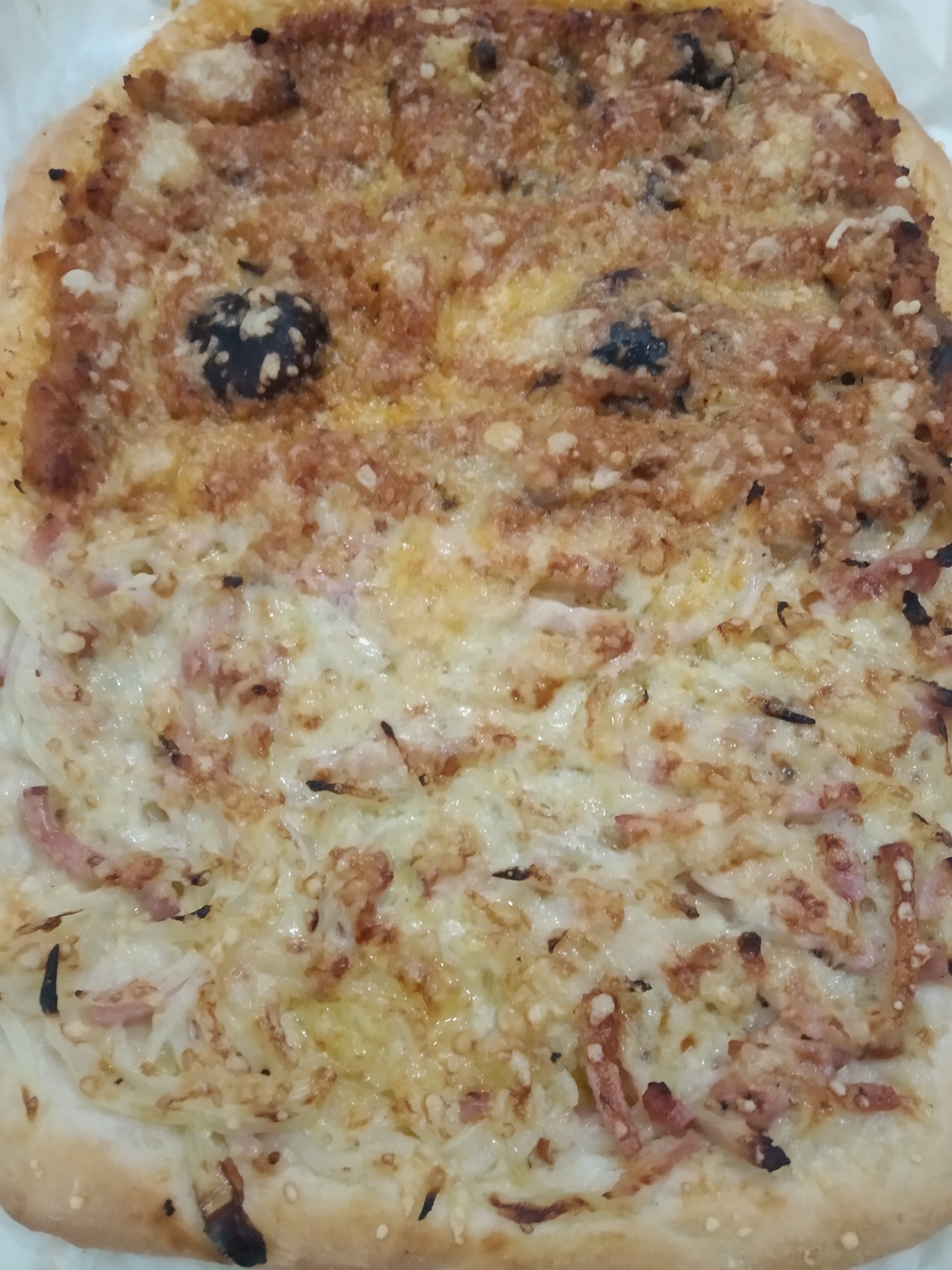 9- Con un rodillo estira la masa formando un rectángulo del tamaño de la bandeja. Distribuye la cobertura de beicon en una mitad de la masa y la de boloñesa en la otra mitad. Espolvorea el queso rallado sobre la pizza.