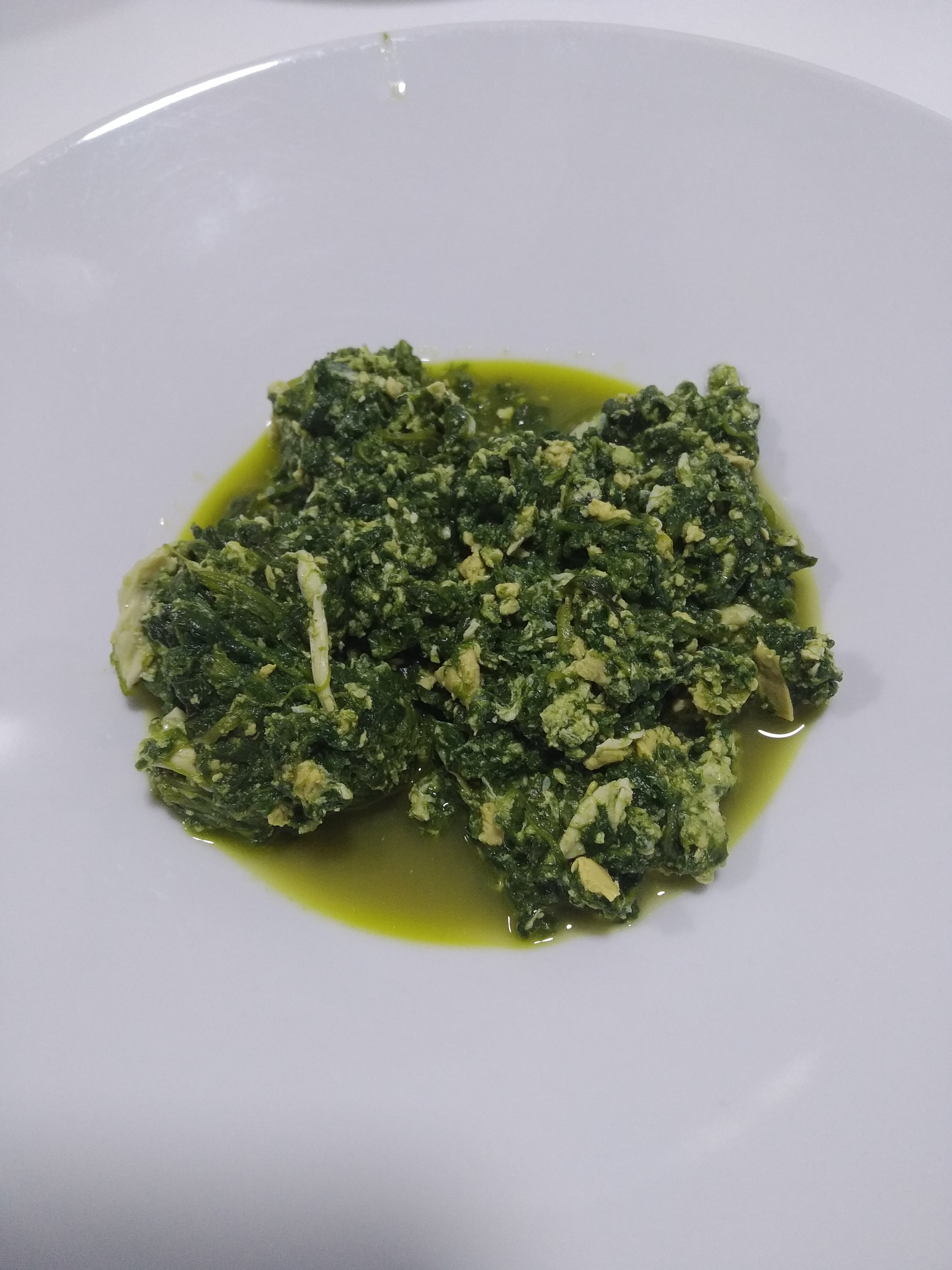 1- Pon el ajo y 30g. de aceite, troceamos 5seg/vel10, calienta el aceite durante 3 min/130°C/vel1.Añade una bolsa de espinacas(300g.) y 30g. de agua y rehoga 8min/120°C/vel2. Saca del vaso y reserva en un bol.