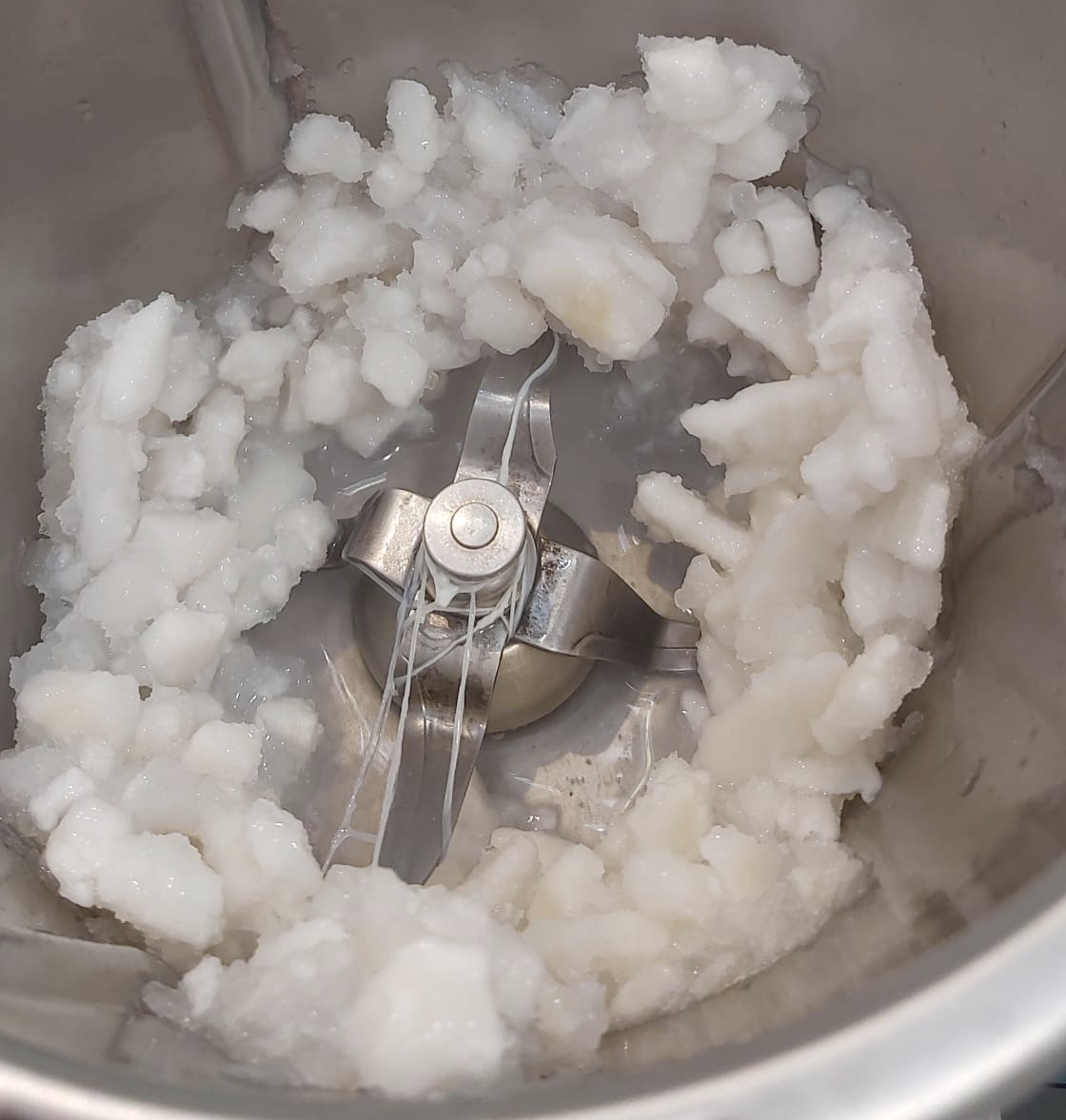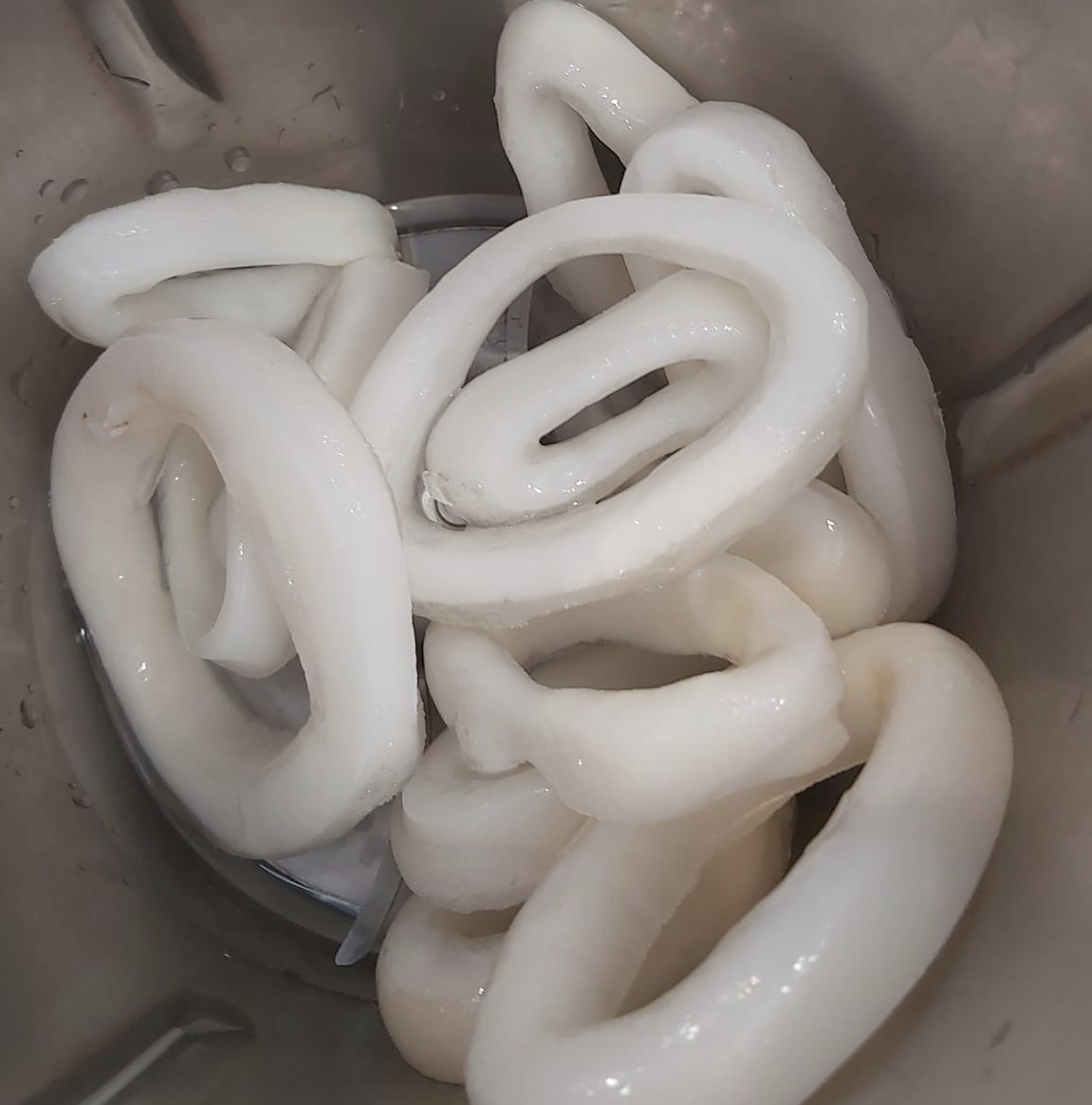 Ponemos en el vaso los calamares ( pueden estar semicongelados) y los troceamos 5 seg. vel. 5. Deben quedar pequeños, si no es así ponemos 2 seg. más. Sacamos a un bol y reservamos.