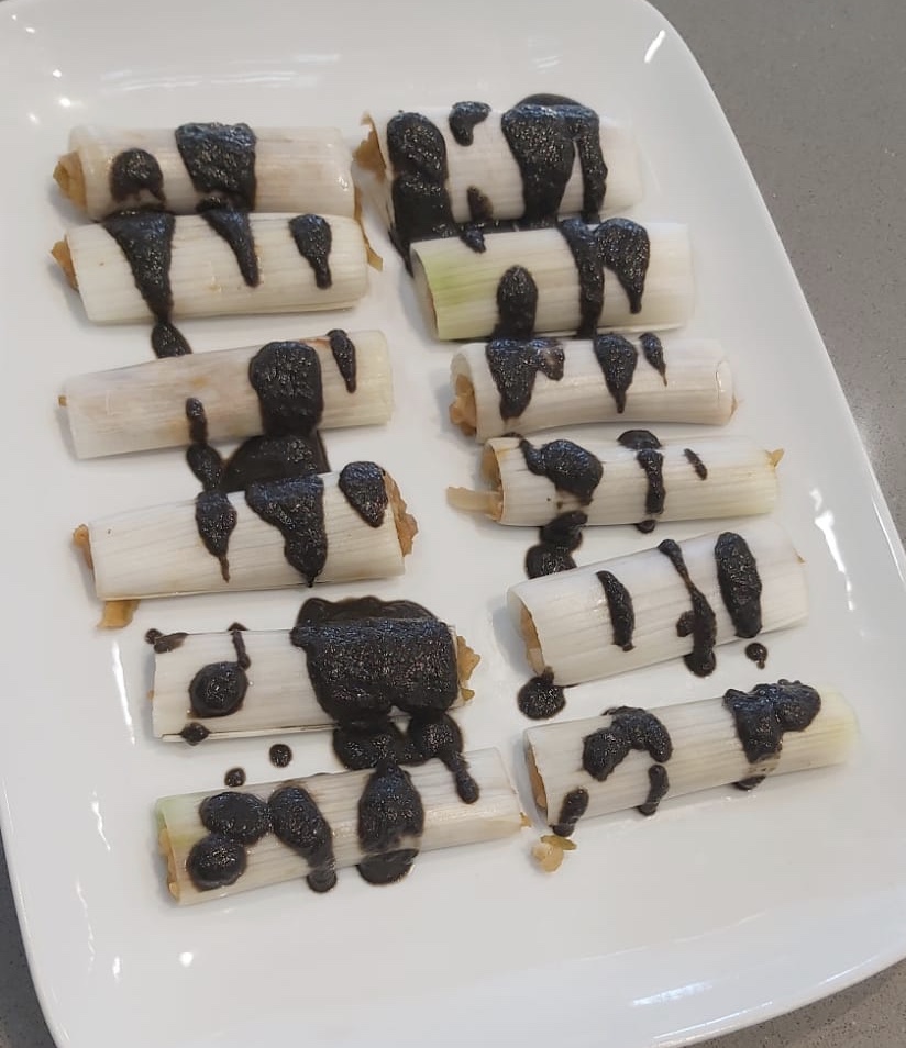 Mientras vamos rellenando los canelones de puerro. Y los vamos dejando en una bandeja apta para horno.