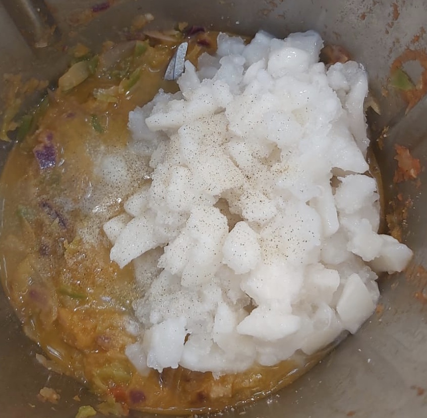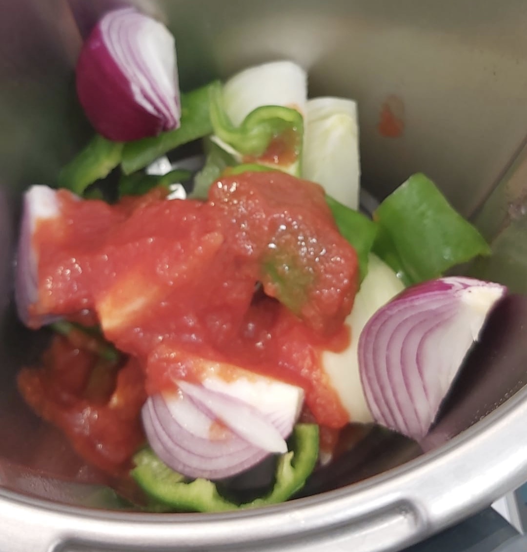 Echamos al bol el aceite, pimiento, cebolla, ajo, tomate, sal y pimienta. Troceamos 4 seg. vel. 4 y sofreímos 10 min. 120º vel. 1.