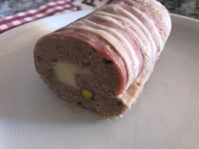- Sobre film transparente extendemos todas las lonchas de bacon bien juntitas. Encima repartimos la carne picada que tenemos en el vaso y encima colocamos las lonchas de jamón, el queso y los frutos secos.