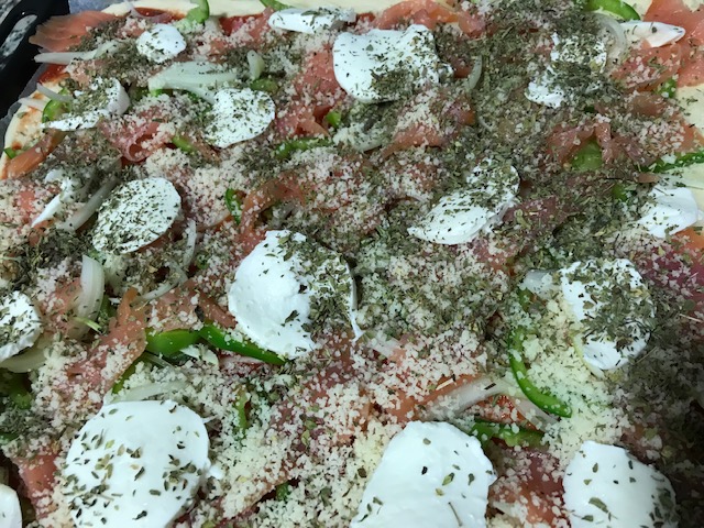 La foto que os pongo lleva: tomate frito thermomix, cebolla cortada muy muy fina con una mandolina, pimiento verde cortado fino también, salmón ahumado, queso emmental rallado, queso mozarella y orégano.