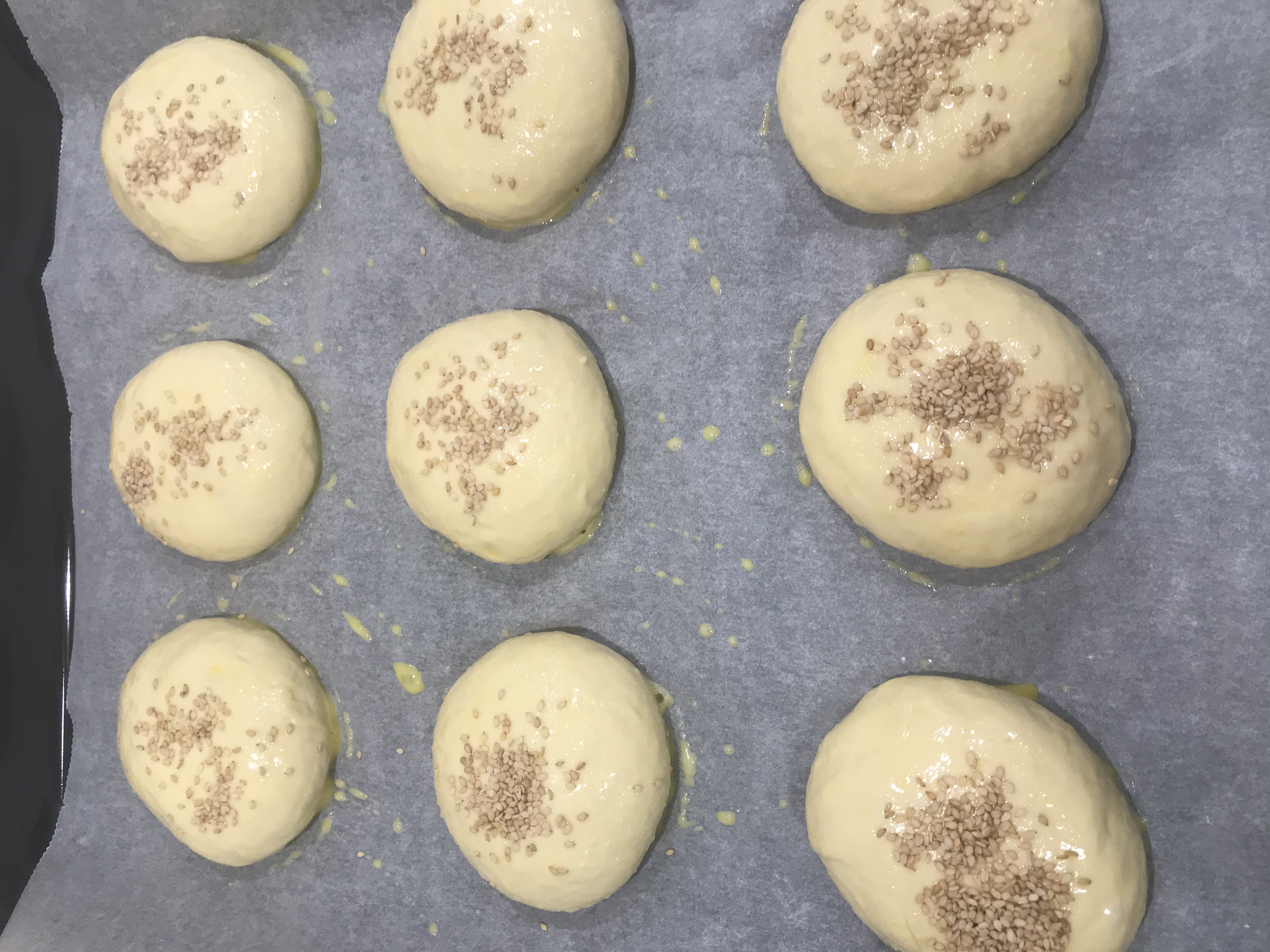 - Los pintamos con huevo y espolvoreamos con semillas de sésamo. Dejamos que vuelvan a fermentar durante otra hora y los horneamos unos 15 minutos a 180º (aunque esto depende mucho de cada horno).