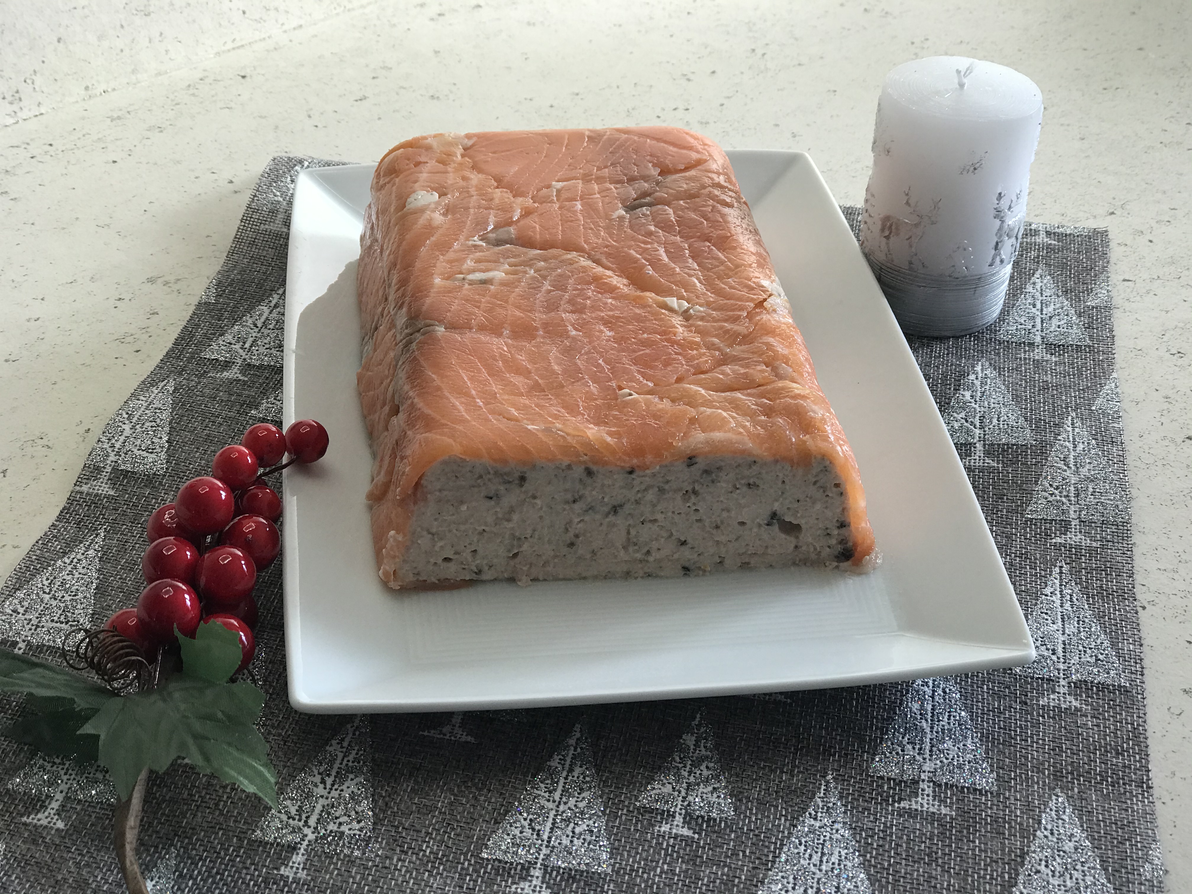 - Forrar un molde de cake de 1 lt. con film transparente. Cubrir el fondo y los laterales con 150 grs de lonchas de salmón y reservar.