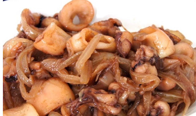 - Incorporar los calamares, sal y pimienta y poner 30 min. 100º giro inverso, vel. cuchara. Poner el cestillo, o la tapa antisalpicaduras, encima de la tapa y así favorecemos la evaporación; tanto las cebollas como los calamares sueltan mucha agua.