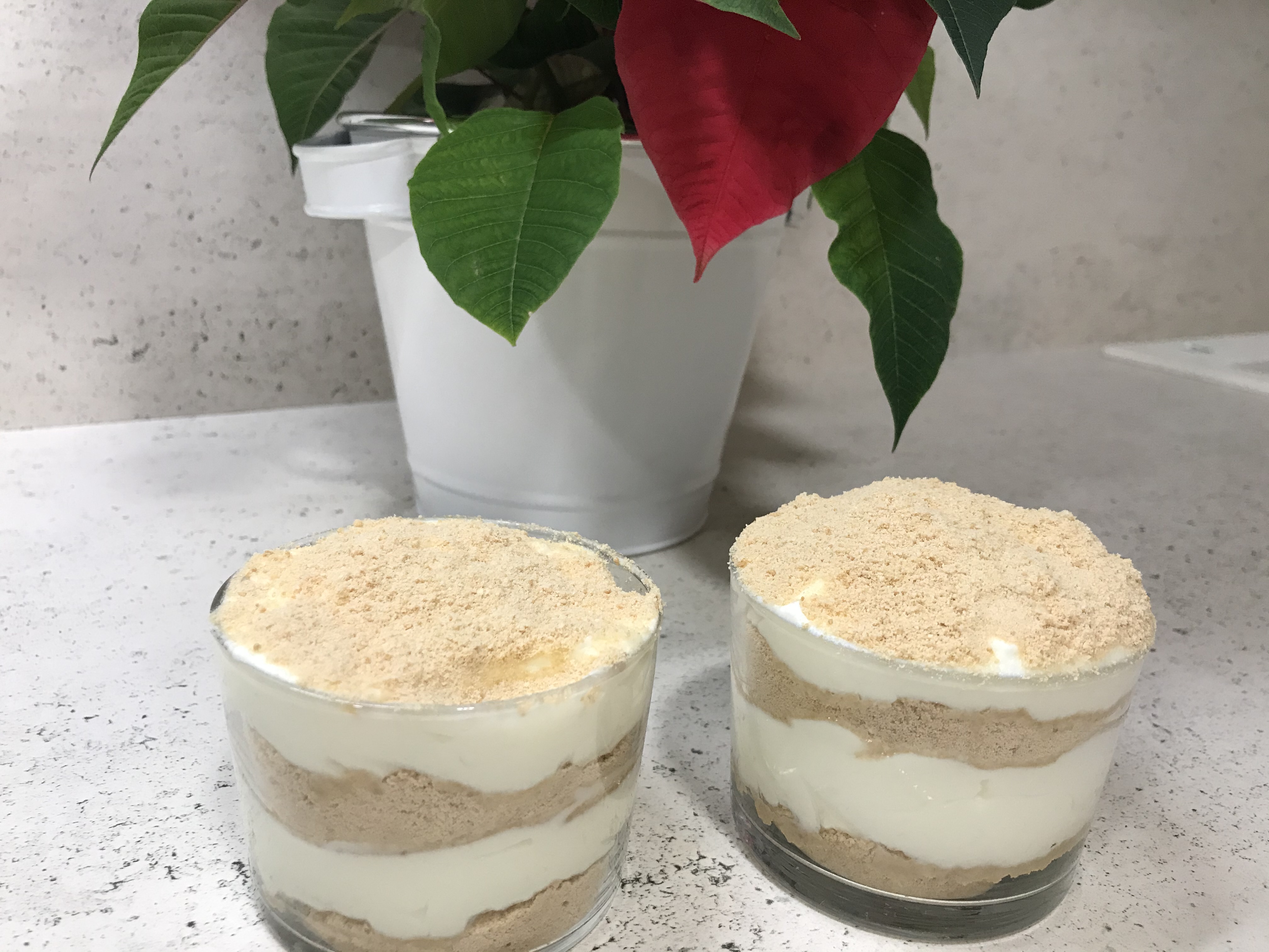 Poner en el fondo de unas copas o unos vasitos una capa de galletas trituradas. Encima una capa de la crema del vaso, otra de galletas, otra de crema y finalizar con una de galletas.
