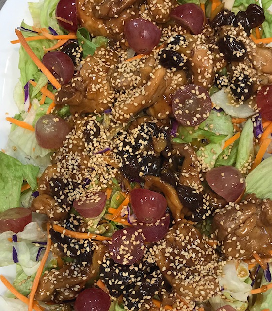 - Mientras poner en una fuente las hojas de lechuga. Verter el contenido del vaso, distribuir las uvas y espolvorear con las semillas de sésamo.