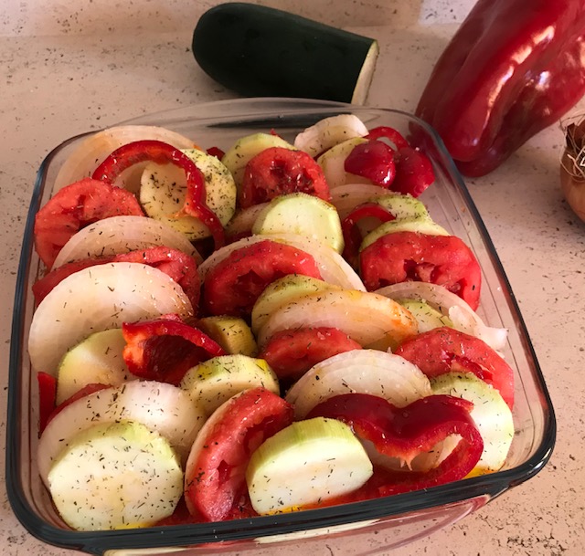 - Echamos la vinagreta sobre las verduras y las metemos al horno unos 50 min. a 180º-200º ( depende de cada horno).