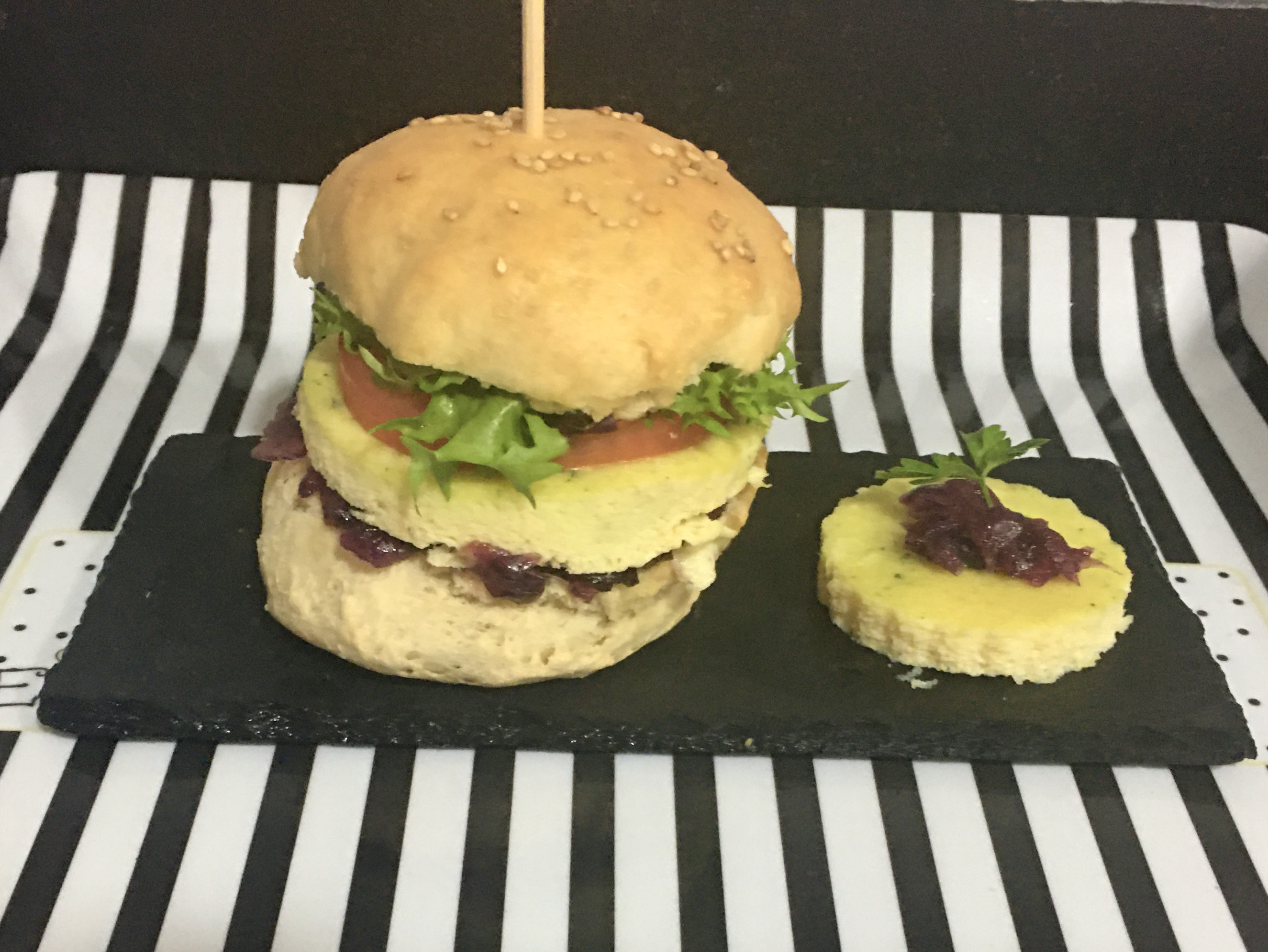 Hamburguesa de tortilla con cebolla roja caramelizada y jamón ibérico o salmón ahumado.